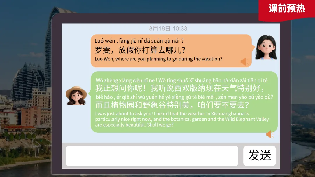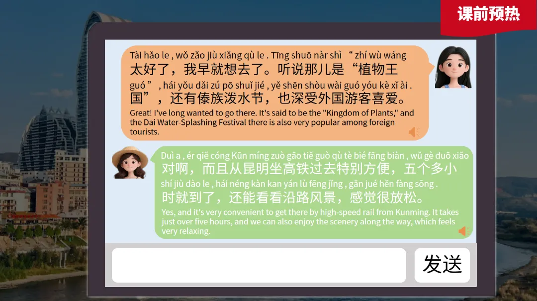 通过两位学生的对话,自然地引出西双版纳的天气、植物园、野象谷以及傣族泼水节等话题,激发学生对西双版纳的向往和探索欲望,同时也为后续的课程学习做好铺垫。