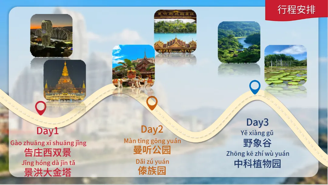课件最后为学生规划了一个精彩的西双版纳三日游行程。第一天游览告庄西双景和景洪大金塔,感受浓郁的傣族风情;第二天前往曼听公园和傣族园,深入了解傣族的历史文化和传统生活;第三天则走进野象谷和中科植物园,领略大自然的神奇与美丽。