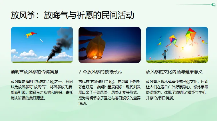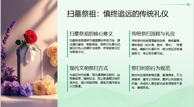 课件严格贴合主题教育流程,涵盖清明文化渊源、传统习俗解读、先烈事迹宣讲、爱国情怀培育、文明祭扫引导等核心内容,图文并茂、寓教于乐,兼顾知识性与教育性;教案为完整详案,明确教育目标、准备工作、流程细节及延伸活动,无需额外修改,可直接用于课堂教学、主题班会等场景。