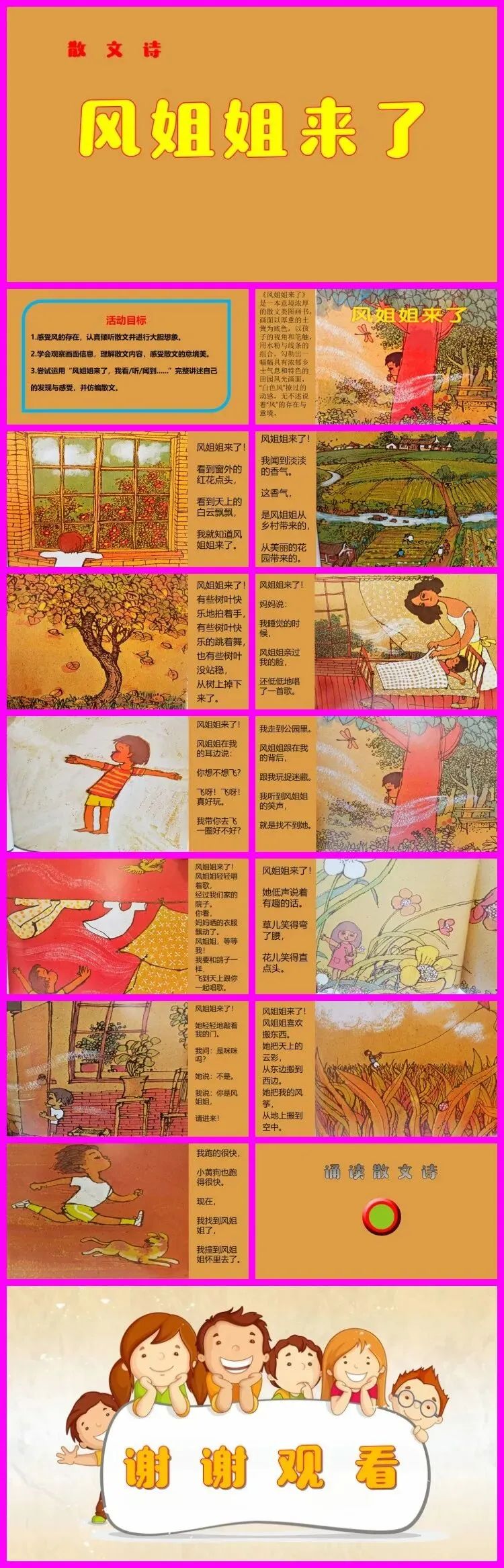 “你们说到了这么多风姐姐来了发生的趣事,我们来看一看书里还会有什么有趣的事发生呢?现在听老师来读一读这篇优美的散文。”