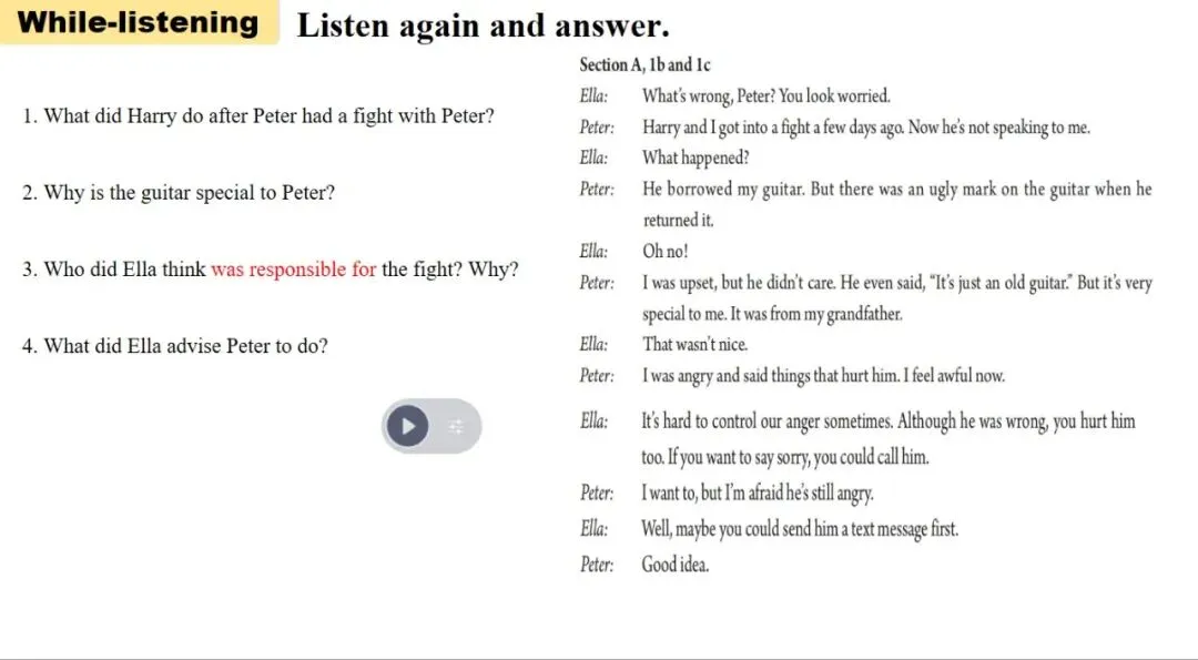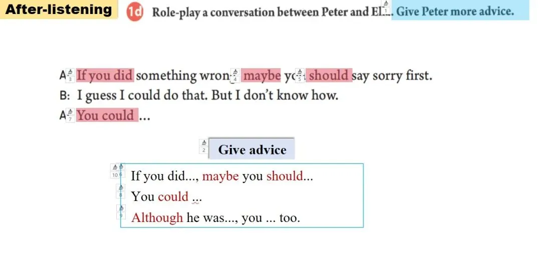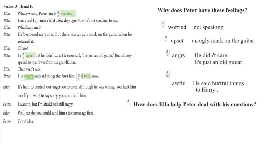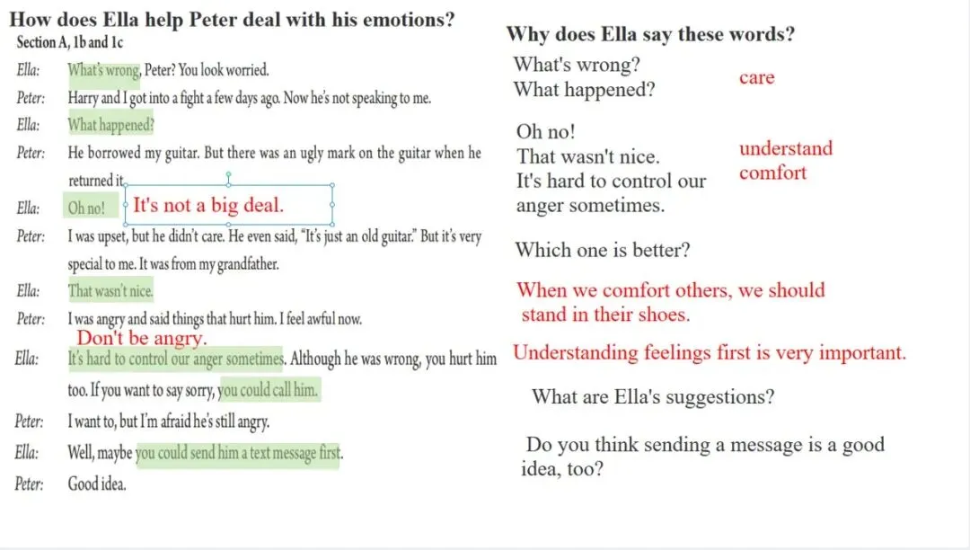现在语言教学特别注重思维的培养,所以在听后安排了以下任务;一边是理解文章,一边是学会如何安慰他人,掌握沟通技能。符合课标:在语言学习中发展思维品质,在思维品质中推进语言学习。