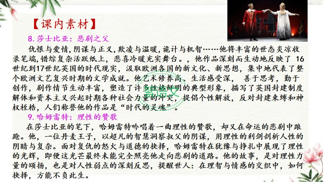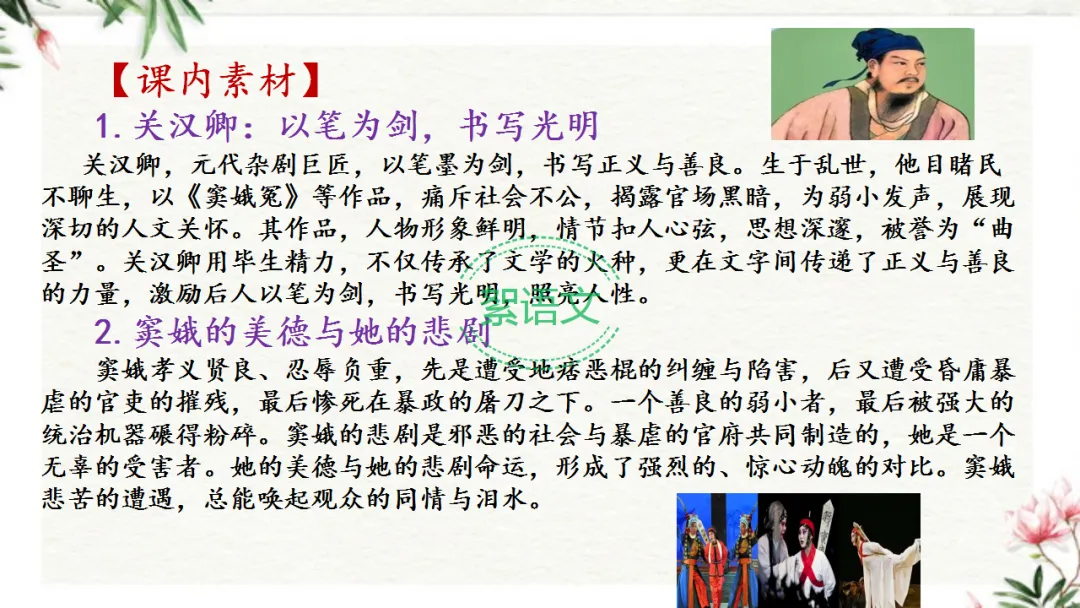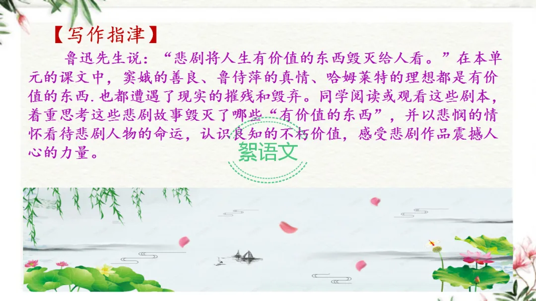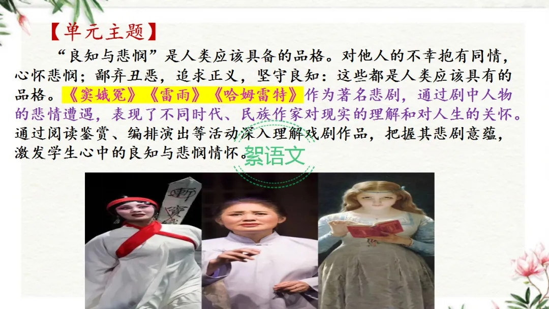鲁迅先生说:“悲剧将人生有价值的东西毁灭给人看。”在本单元的课文中,窦娥的善良、鲁侍萍的真情、哈姆莱特的理想都是有价值的东西.也都遭遇了现实的摧残和毁弃。同学阅读或观看这些剧本,着重思考这些悲剧故事毁灭了哪些“有价值的东西”,并以悲悯的情怀看待悲剧人物的命运,认识良知的不朽价值,感受悲剧作品震撼人心的力量。