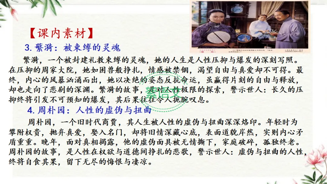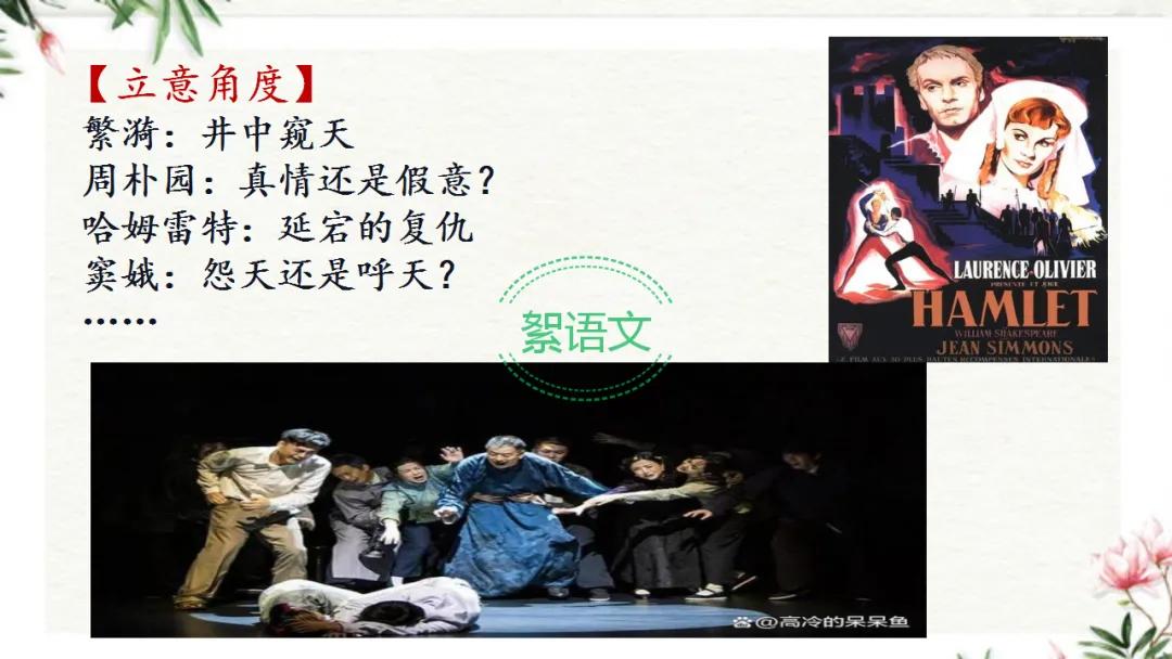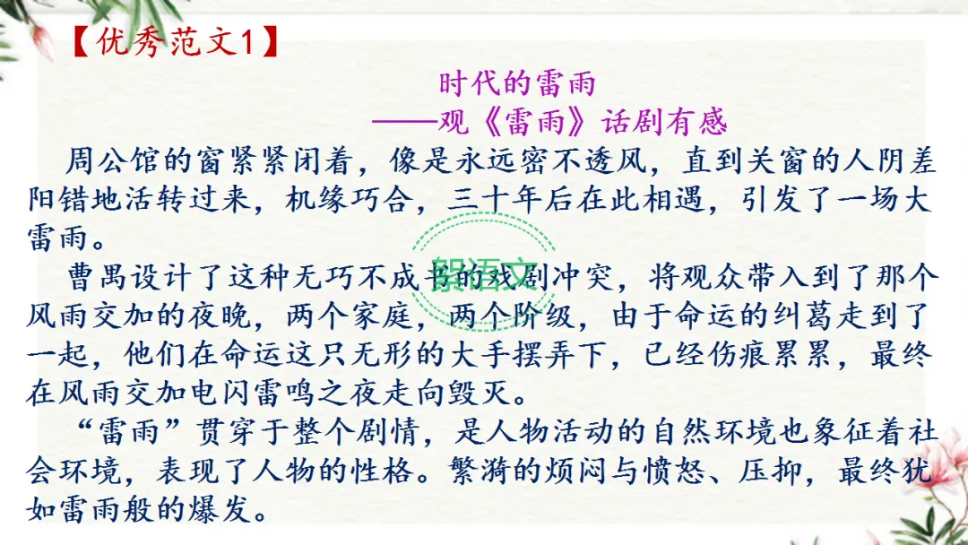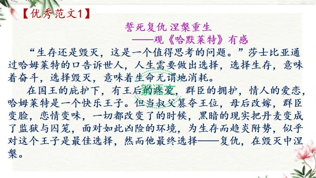 要集中某一点生发感想,或者是人物形象分析,或者是对剧本艺术的赏析,或者是对悲剧根源的分析,千万不能一篇800字的文章涉及几个人物,要集中评论某一个人物容易深入,也不应该所有人物都评论到,那样分散笔墨,不能把自己的心得写到位,写的深刻。