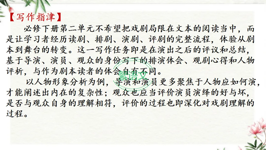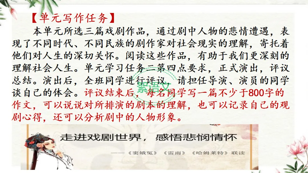 本单元所选三篇戏剧作品,通过剧中人物的悲情遭遇,表现了不同时代、不同民族的剧作家对社会现实的理解,寄托着他们对人生的深切关怀。阅读这些作品,有助于我们更深刻的理解社会人生。单元学习任务二第四点要求,正式演出,评议总结。演出后,全班同学进行评议,请担任导演、演员的同学谈自己的体会。评议结束后,每名同学写一篇不少于800字的作文,可以说说对所排演的剧本的理解,也可以记录自己的观剧心得,还可以分析剧中的人物形象。