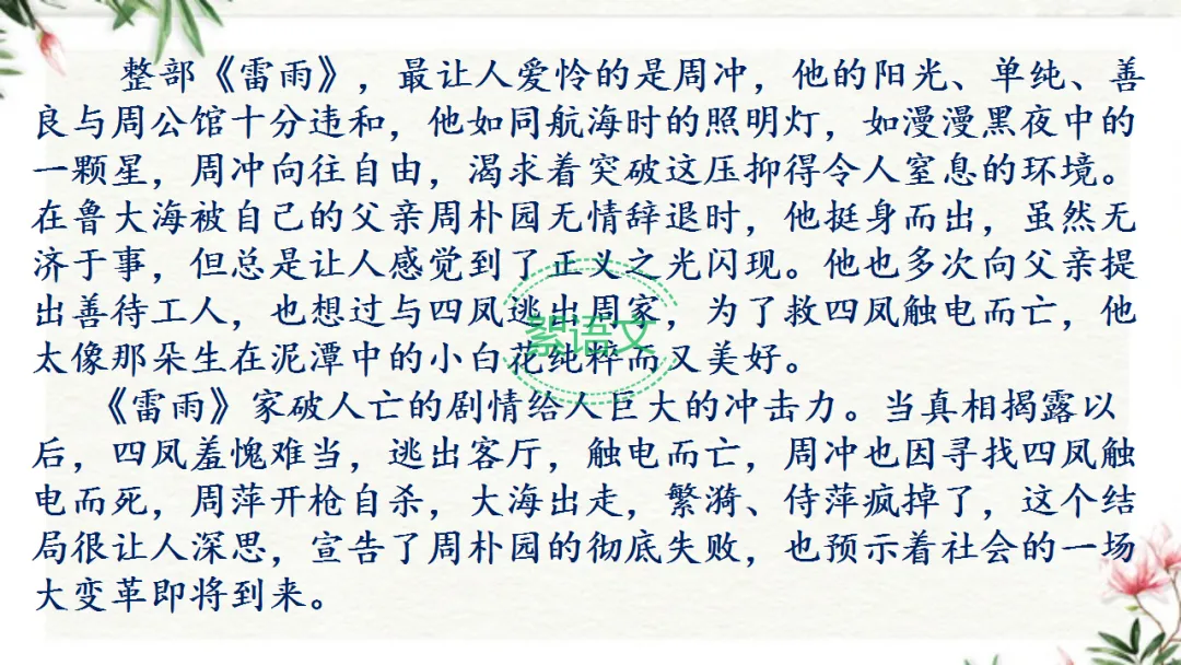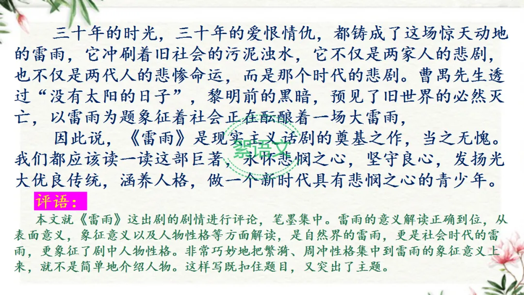 本文就《雷雨》这出剧的剧情进行评论,笔墨集中。雷雨的意义解读正确到位,从表面意义,象征意义以及人物性格等方面解读,是自然界的雷雨,更是社会时代的雷雨,更象征了剧中人物性格。非常巧妙地把繁漪、周冲性格集中到雷雨的象征意义上来,就不是简单地介绍人物。这样写既扣住题目,又突出了主题。