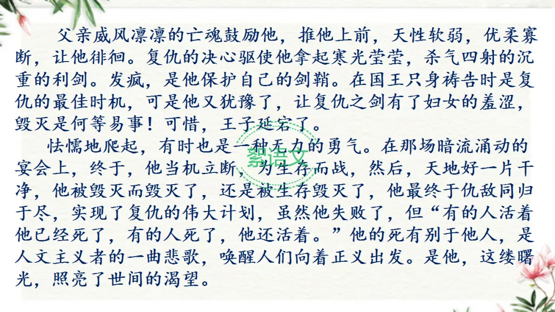 窦娥虽血溅白练,但她的精神感天动地,后终沉冤昭雪;侍萍虽毁灭于封建社会的雷雨之中,但雷声殷殷,一场社会变革终将到来;哈姆雷特选择与邪恶同归于尽,但他作为人文主义者的责任与良知在历史长河中熠熠闪光。正义者或许会付出代价,但他们的鲜血不会白流,他们的道德之花灼灼开放,化为落红滋养了无数的世人。正是因为有他们的存在与努力,我们的文明之花才能结出丰硕的果。