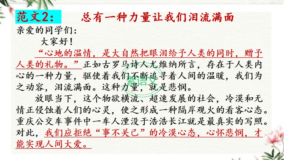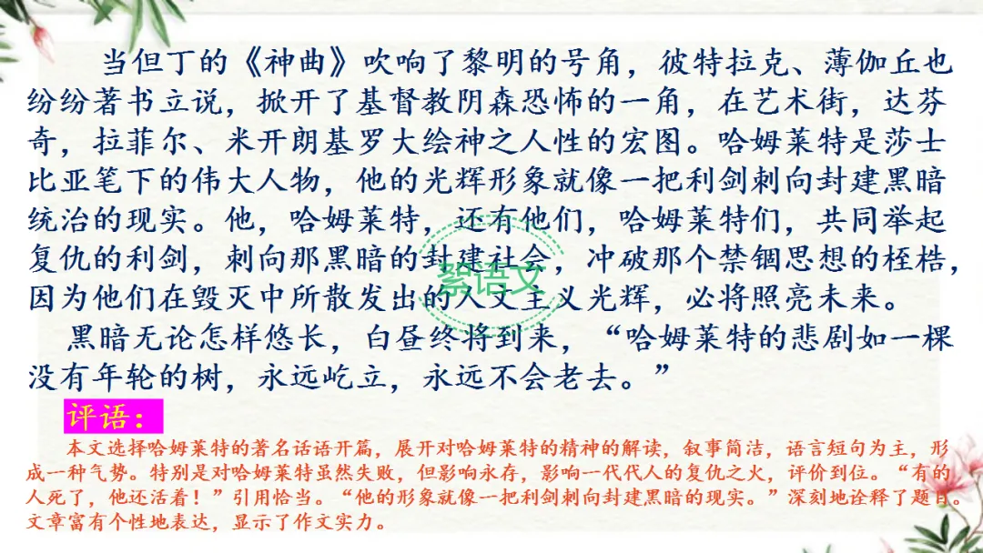 (4)结:结尾归纳看法,呼应作品,总结全篇