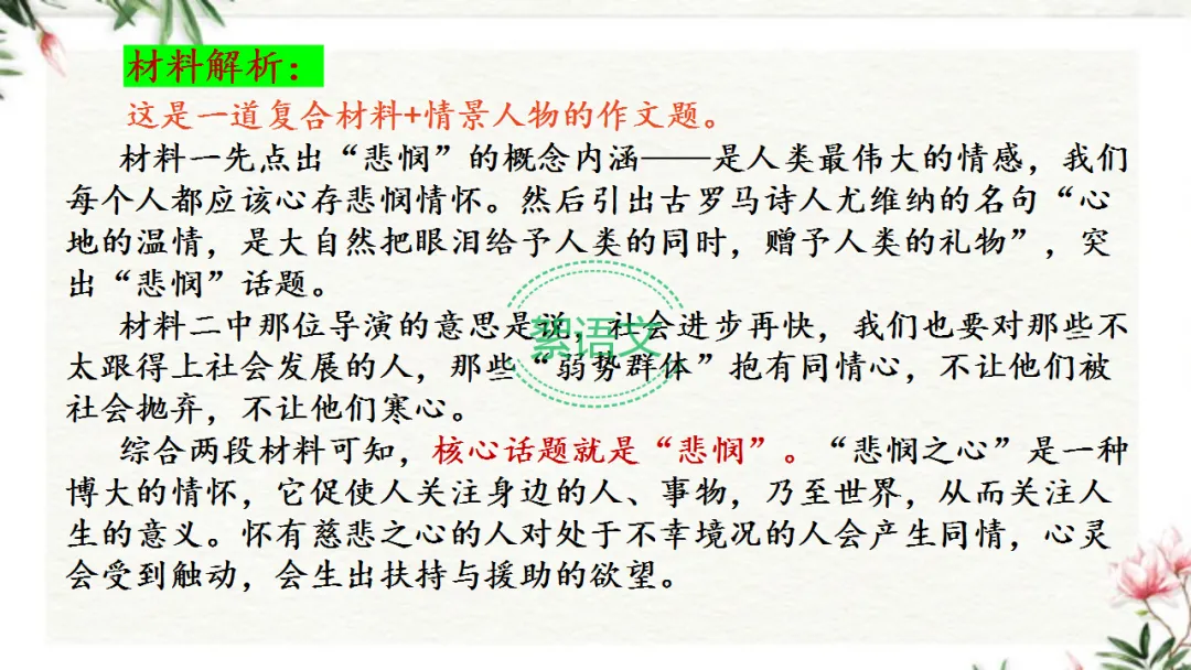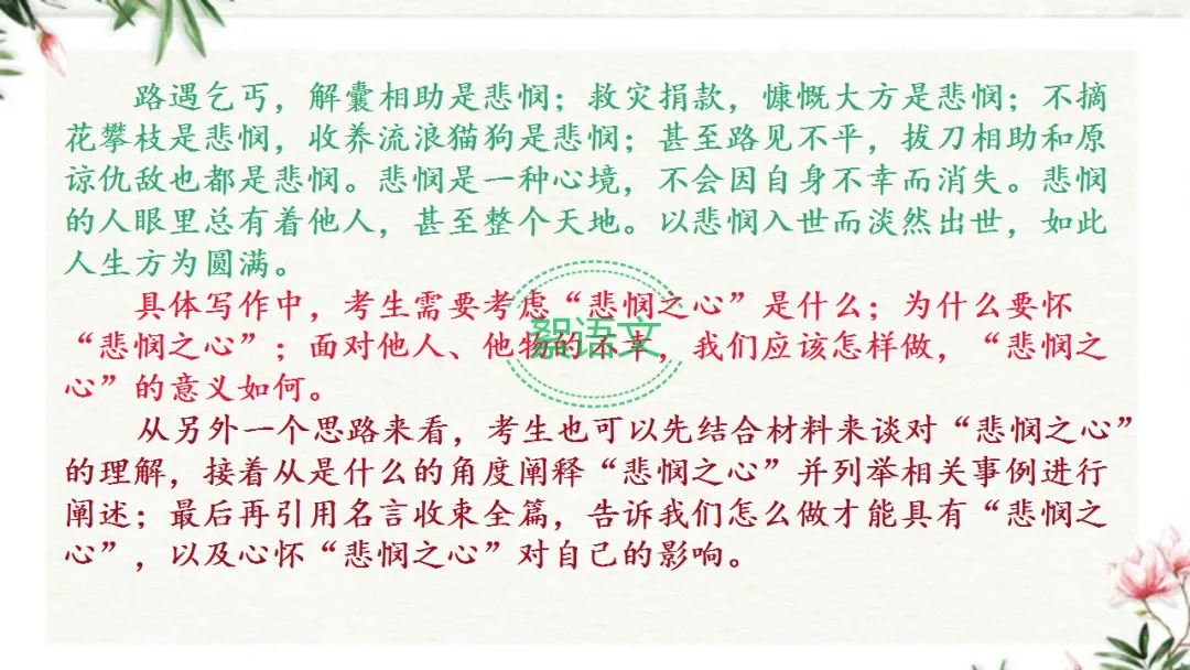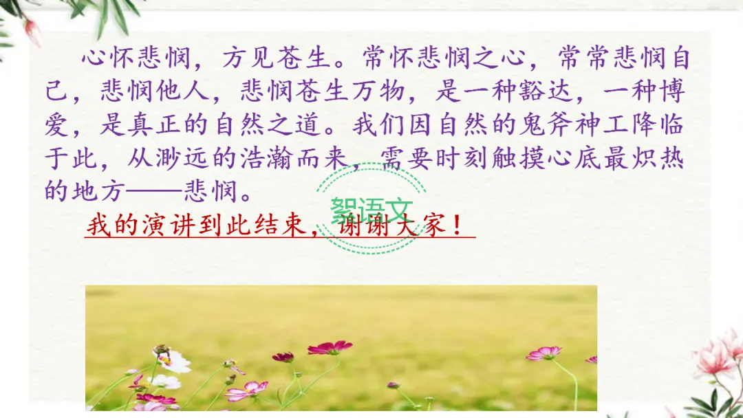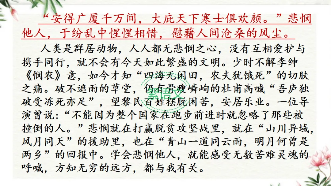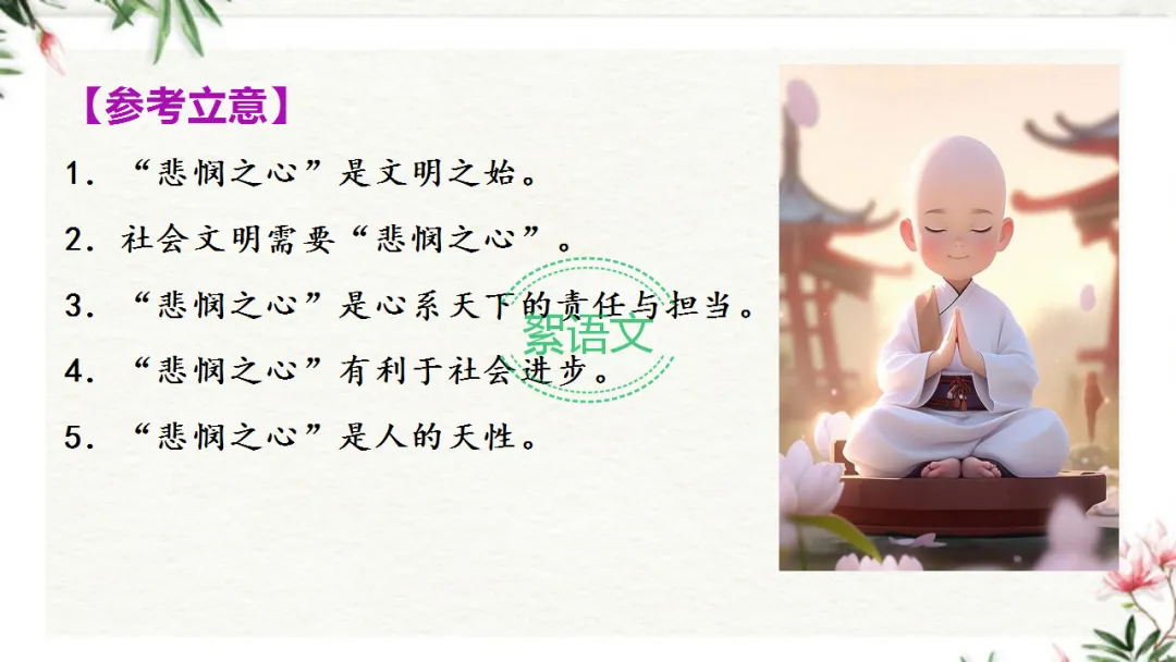 7.内心的广阔足以装下悲悯,四肢的灵活也足以流露出我们的良知。正如孟子所说,“恻隐之心,仁也”。心怀悲悯,发现窦娥的善良、鲁侍萍的真情、哈姆莱特对理想的执着,于是勇敢捍卫它们;坚守良知,于是大块于奸人被惩罚,恶人总将受审判。在这一过程中,我们悲悯着、善良着,我们思索着、守护着。心怀理想,坚守良知,让社会更美好,让文明绽放光芒。