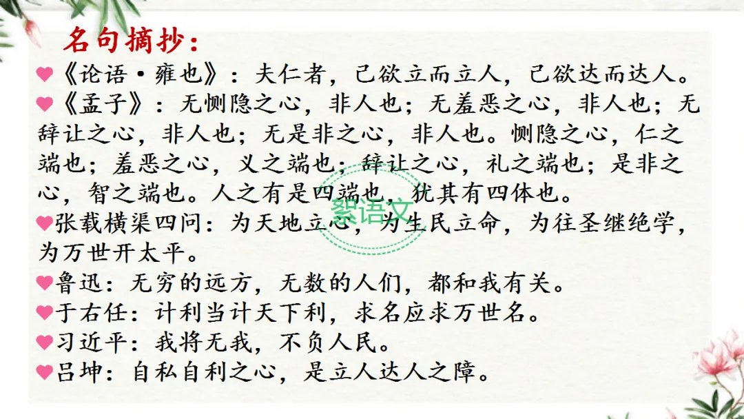 10.心怀悲悯,关爱他人,让社会充满温馨与和谐。关汉卿通过窦娥的悲惨故事,批判黑暗现实、同情百姓命运;曹禺通过鲁侍萍的遭遇,对其给予深切的同情;莎士比亚通过哈姆雷特的命运,悲悯人文主义者的徘徊与困境。作者们心怀悲悯之心,引我们对现实做更深入的体察。所幸时移俗易,现实中怀悲悯之心帮助他人,让他们脱离苦海的事例比比皆是。牛振远毫不犹豫拿出全部积蓄,让因没有经济来源而辍学的孤儿们对未来重新充满希望;曼德拉将大量精力用于平息黑人选民的怨恨,缓和种族间的矛盾;巴菲特将自己很大一笔财产献出做慈善事业,回报社会。透过这些事例我们知道,悲悯之情帮助弱势群体克服眼前的困难,重塑生活的信念,让人们都能感受到彼此的善意。因此,为创造理想社会,我们应心怀悲悯之心,关怀和同情他人,让人与人之间多一份温情。11.坚守良知,坚定脚步,在时代的洪流中恒持已路。有价值的东西被毁灭,让我们深思,人类得以维系的美好不能轻易失去,应让良知永存于心。良知是海明威不顾生命危险深入战场第一线,不违背职业道德,做战地记者时坚守的“真实反映战争”;良知是抗疫时期,无数医护人员“舍小家,为大家”的道德自觉;良知是当今世界共同保护生态、爱护地球的自然之爱。于个人而言,良知是“出淤泥而不染,濯清涟而不妖”的高洁情操;于社会而言,良知是“老吾老以及人之老,幼吾幼以及人之幼”的理想氛围;于世界而言,良知是“人类命运共同体”的美好蓝图。因此,坚守良知让人的精神得到升华,让社会满含温度。我们应当在危难之际、时刻唤醒良知,保持赤子之心,在时代洪流中恒持已路。