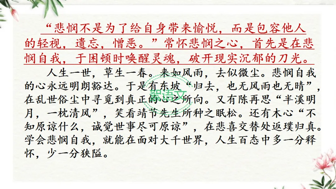 9.当今社会,坚守良知,心怀悲悯,是每个人的责任和基本的道德标准。雨果说:“良心的觉醒就是灵魂的伟大。”我们应守住纯洁的灵魂,有“出淤泥而不染,濯清涟而不妖”的高尚情操,提高自身内在的修养,遵守内心的道德准则。常怀悲悯之心,在关怀与善意中实现人格的提升,灵魂的净化,燃起温暖人间的薪火,让这个世界充满善良和温情。