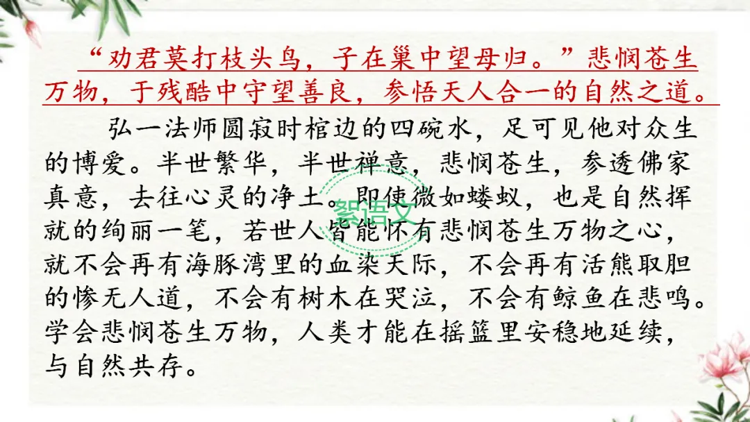 联系实际要切合自身实际,譬如“是生存还是毁灭,这是值得考虑的问题。”我们学生存在这样的追问吗?生存,就必须努力奋斗,提升自己的综合素养,否则,浑浑噩噩,消磨时光,未老先衰,不也是消磨青春吗?语言表达需得体,有分寸。本单元的主题的是悲悯和良知,对美好的事物,对不幸遭遇的人充满同情关怀,如果丧尽天良,走向了反面,那就万恶不赦了。