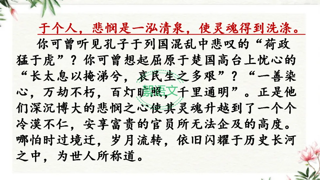 你可曾听见孔子于列国混乱中悲叹的“荷政猛于虎”?你可曾想起屈原于楚国高台上忧心的“长太息以掩涕兮,哀民生之多艰”?“一善染心,万劫不朽,百灯旷照,千里通明”。正是他们深沉博大的悲悯之心使其灵魂升越到了一个个冷漠不仁,安享富贵的官员所无法企及的高度。哪怕时过境迁,岁月流转,依旧闪耀于历史长河之中,为世人所称道。