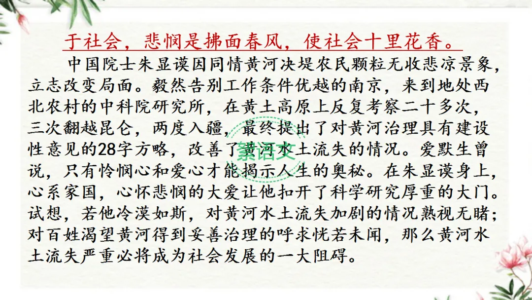 中国院士朱显谟因同情黄河决堤农民颗粒无收悲凉景象,立志改变局面。毅然告别工作条件优越的南京,来到地处西北农村的中科院研究所,在黄土高原上反复考察二十多次,三次翻越昆仑,两度入疆,最终提出了对黄河治理具有建设性意见的28字方略,改善了黄河水土流失的情况。爱默生曾说,只有怜悯心和爱心才能揭示人生的奥秘。在朱显谟身上,心系家国,心怀悲悯的大爱让他扣开了科学研究厚重的大门。试想,若他冷漠如斯,对黄河水土流失加剧的情况熟视无睹;对百姓渴望黄河得到妥善治理的呼求恍若未闻,那么黄河水土流失严重必将成为社会发展的一大阻碍。