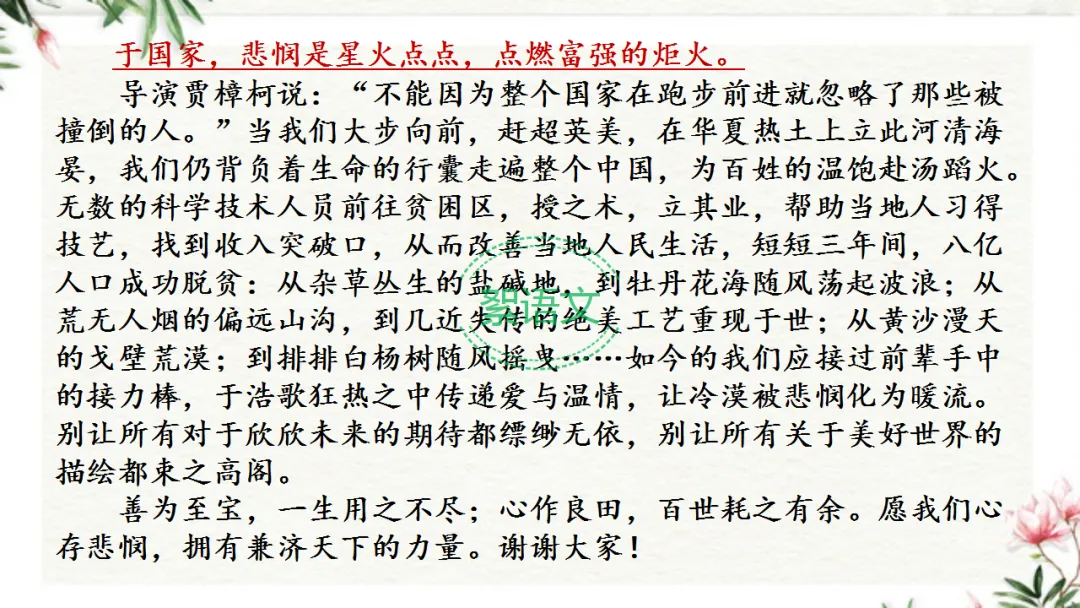 导演贾樟柯说:“不能因为整个国家在跑步前进就忽略了那些被撞倒的人。”当我们大步向前,赶超英美,在华夏热土上立此河清海晏,我们仍背负着生命的行囊走遍整个中国,为百姓的温饱赴汤蹈火。无数的科学技术人员前往贫困区,授之术,立其业,帮助当地人习得技艺,找到收入突破口,从而改善当地人民生活,短短三年间,八亿人口成功脱贫:从杂草丛生的盐碱地,到牡丹花海随风荡起波浪;从荒无人烟的偏远山沟,到几近失传的绝美工艺重现于世;从黄沙漫天的戈壁荒漠;到排排白杨树随风摇曳……如今的我们应接过前辈手中的接力棒,于浩歌狂热之中传递爱与温情,让冷漠被悲悯化为暖流。别让所有对于欣欣未来的期待都缥缈无依,别让所有关于美好世界的描绘都束之高阁。