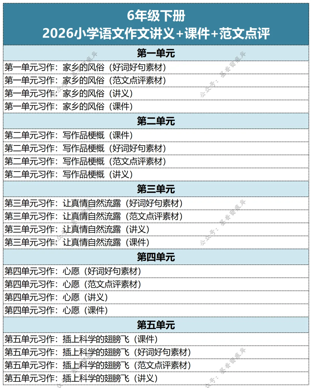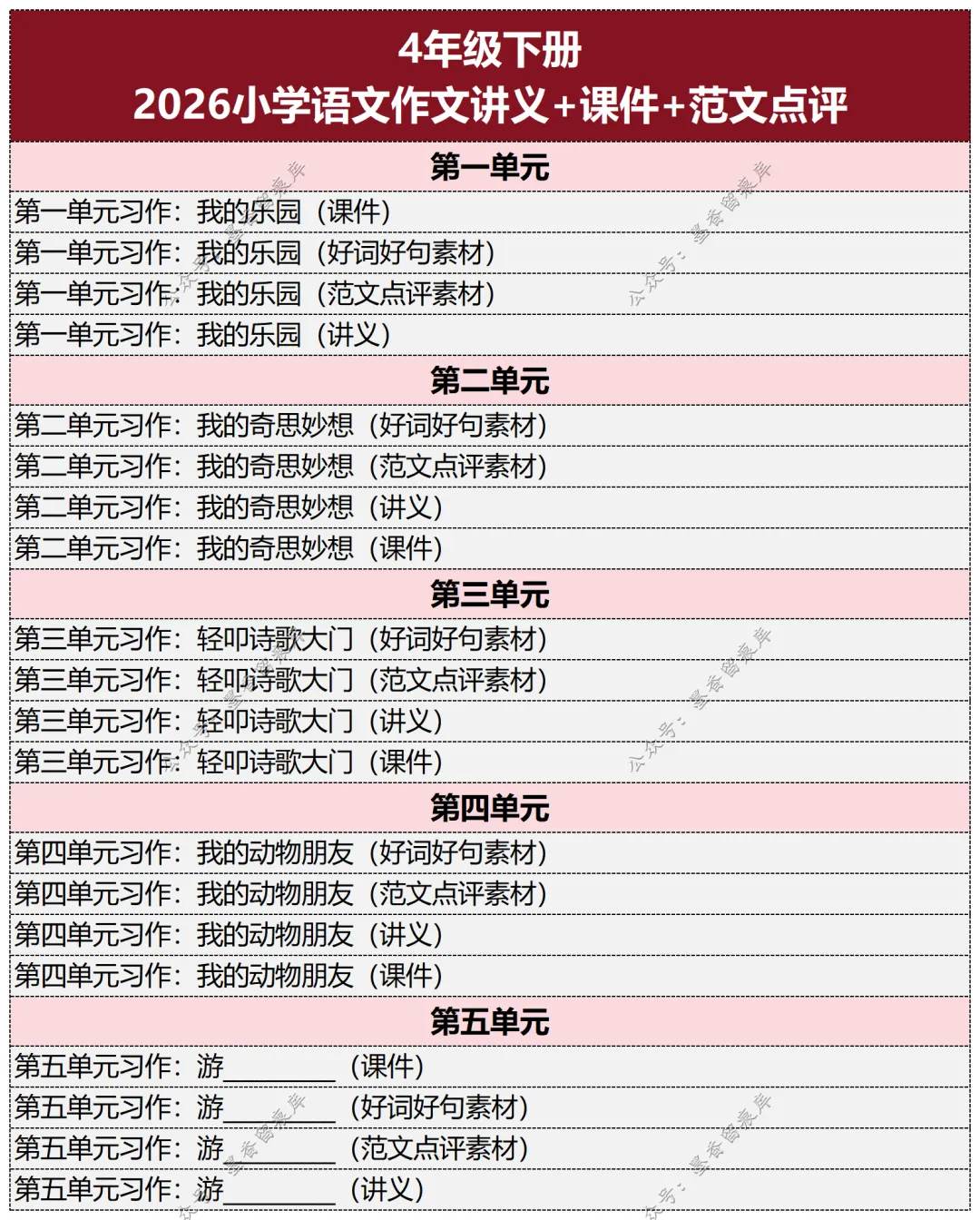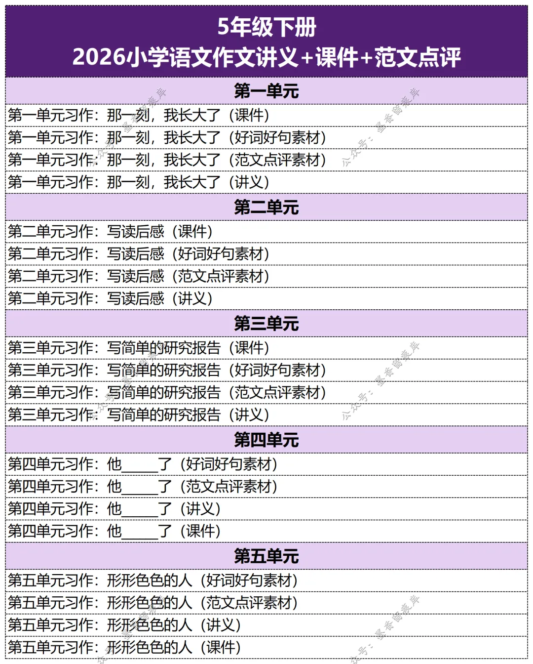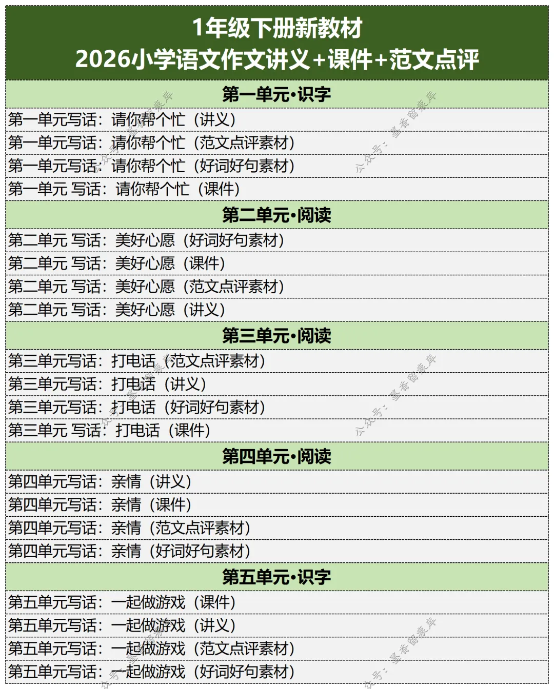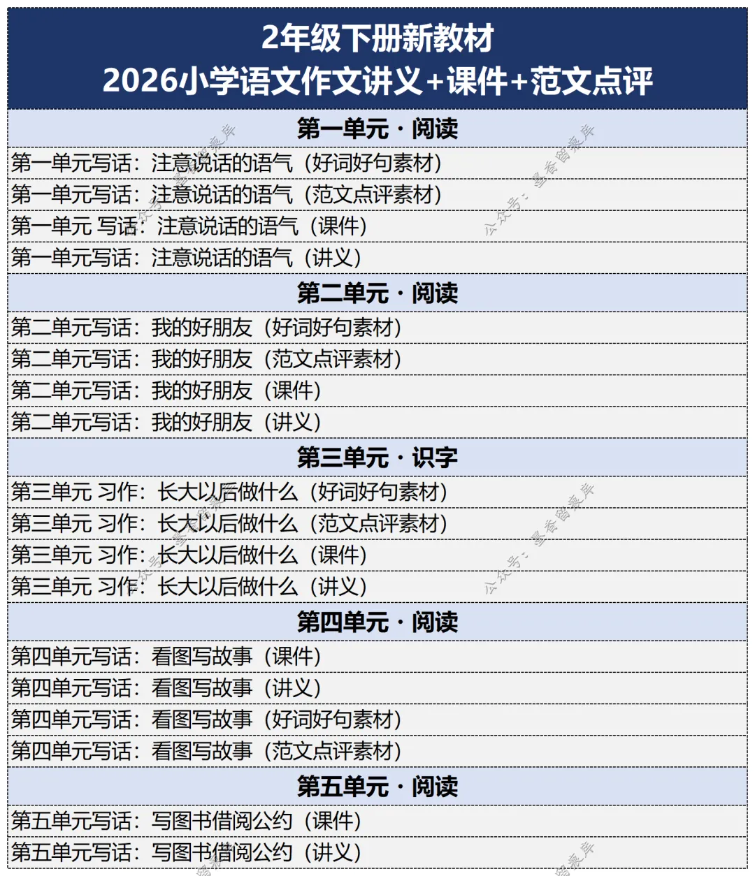 每个年级包含五个单元,阅读及识字,每个单元包含课件ppt,word讲义,范文点评素材word,好词好句素材word。