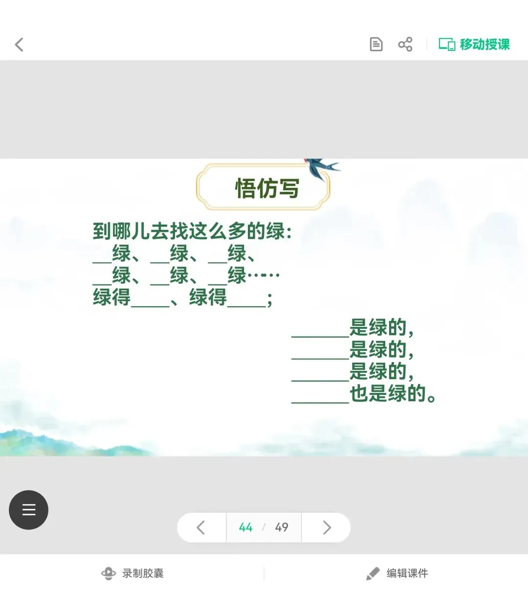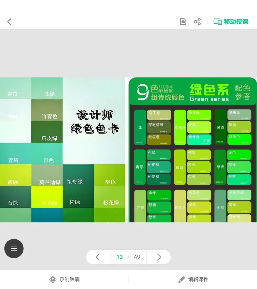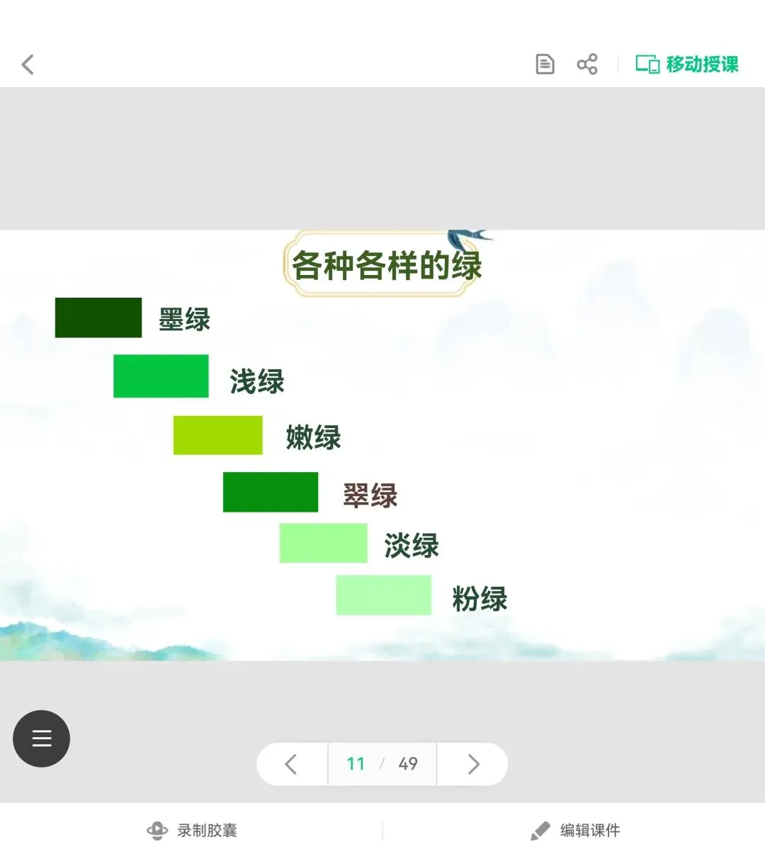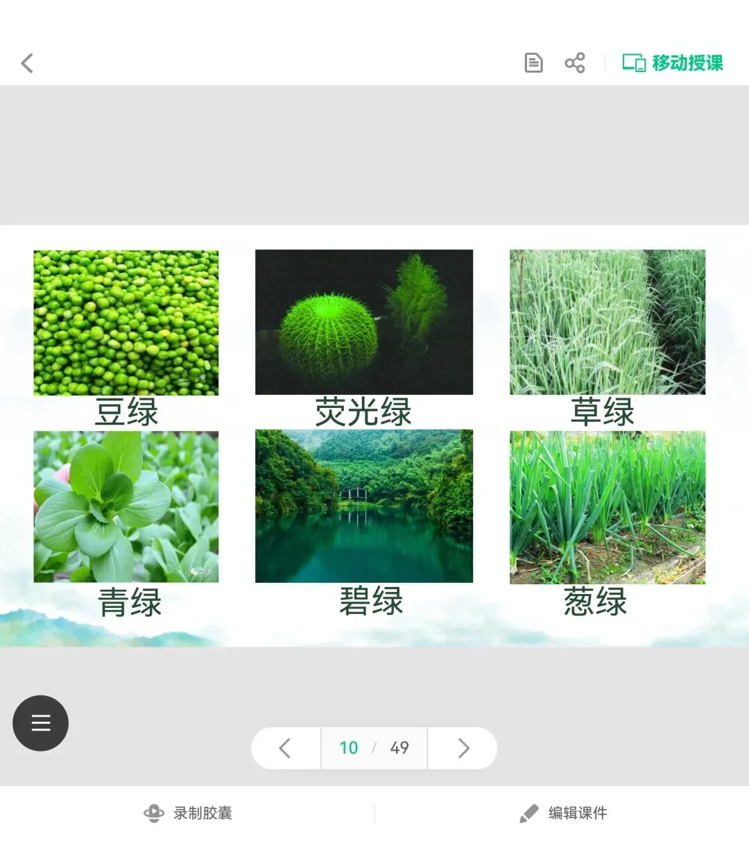 各种绿色的名称,让学生视觉上有了冲击,开启课程,就有了满眼是绿的感觉😃