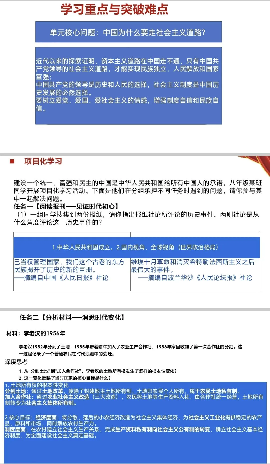 通过完整时间轴梳理1949-1957年核心事件,将零散史实按时间线串联,帮助学生建立时空框架;针对“近代社会性质三次变化”这一难点,以明确表述梳理转变节点,结合“资本主义道路在中国走不通”的结论,为核心问题解答筑牢基础,难点突破直击学生认知痛点。