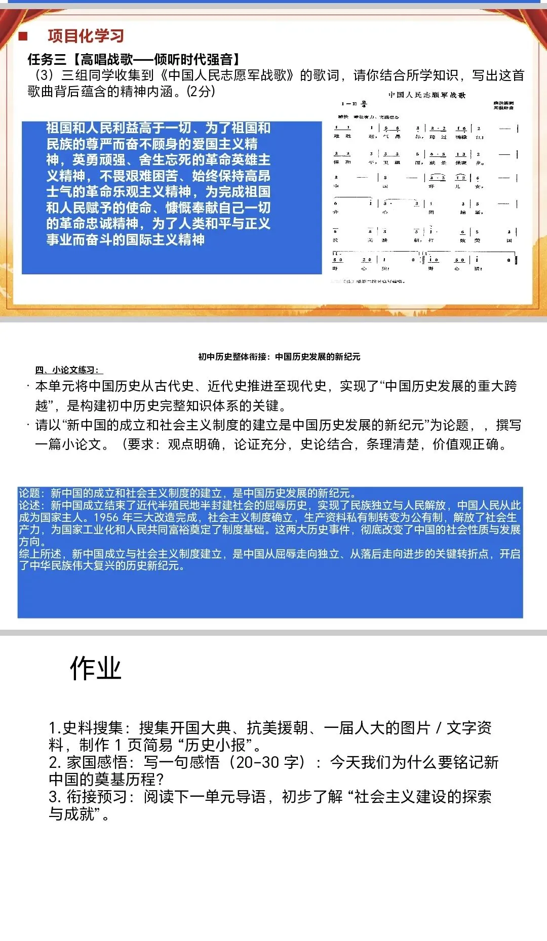 作业设计分层且有梯度,史料搜集、家国感悟侧重单元知识巩固与家国情怀培育,衔接预习则实现本单元与下一单元的内容关联,帮助学生构建完整的中国现代史知识体系;同时小论文环节关联初中历史整体脉络,点明单元在“古代史—近代史—现代史”中的定位,体现大历史观。