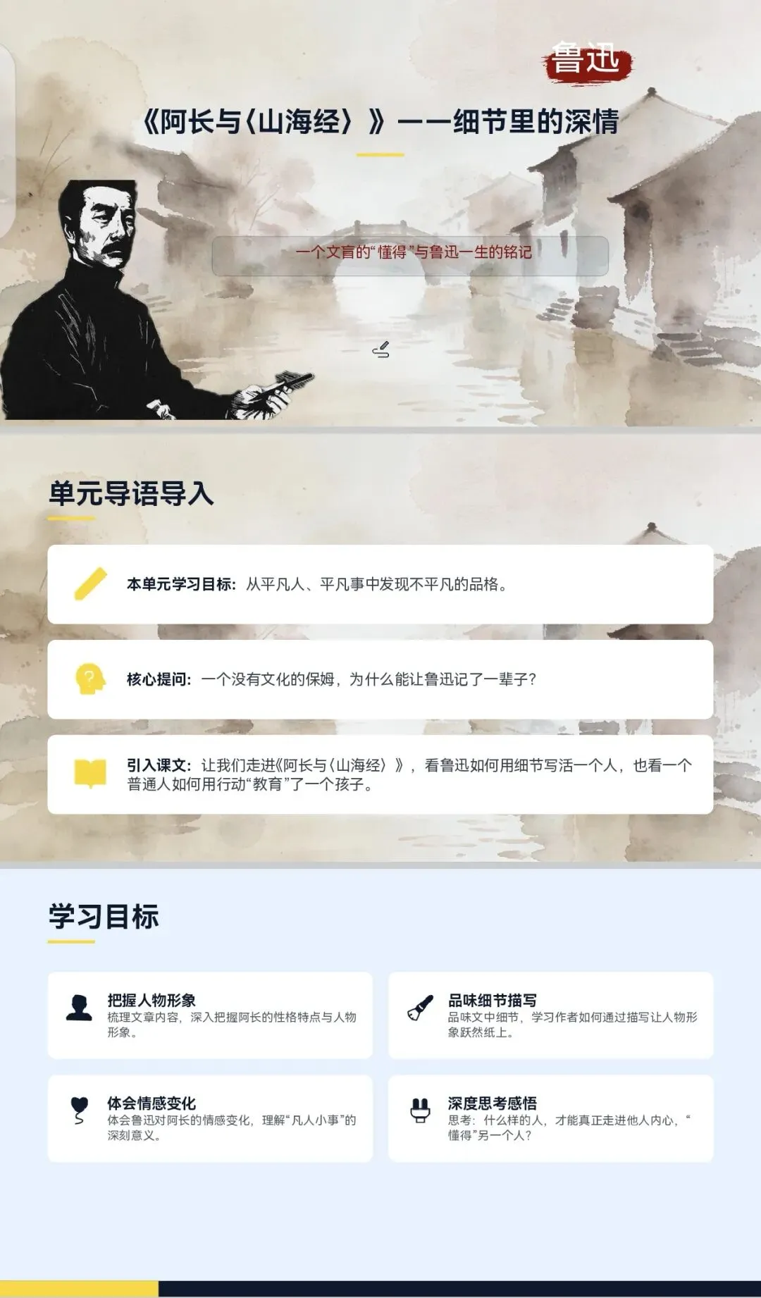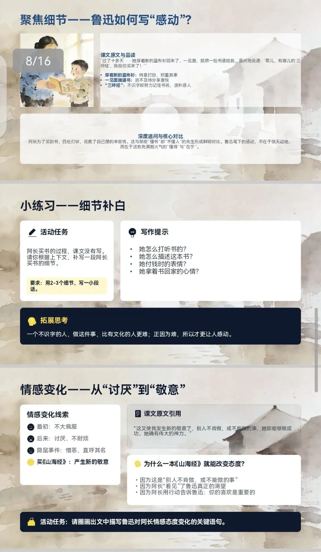 这份课件通过精心设计的问题链、细腻的文本品读和生动的插画辅助,引导学生从 “凡人小事” 中发现不平凡的品格,学习用细节描写刻画人物的方法,并深刻体会人与人之间那份纯粹而深沉的情感。