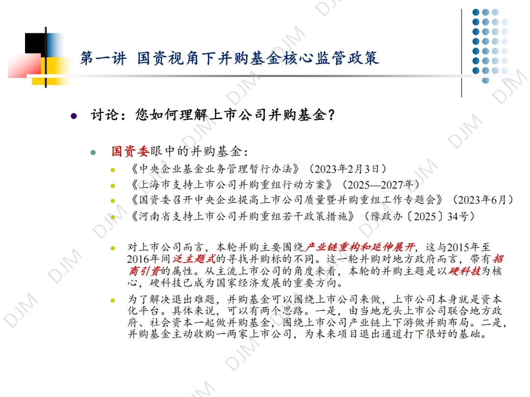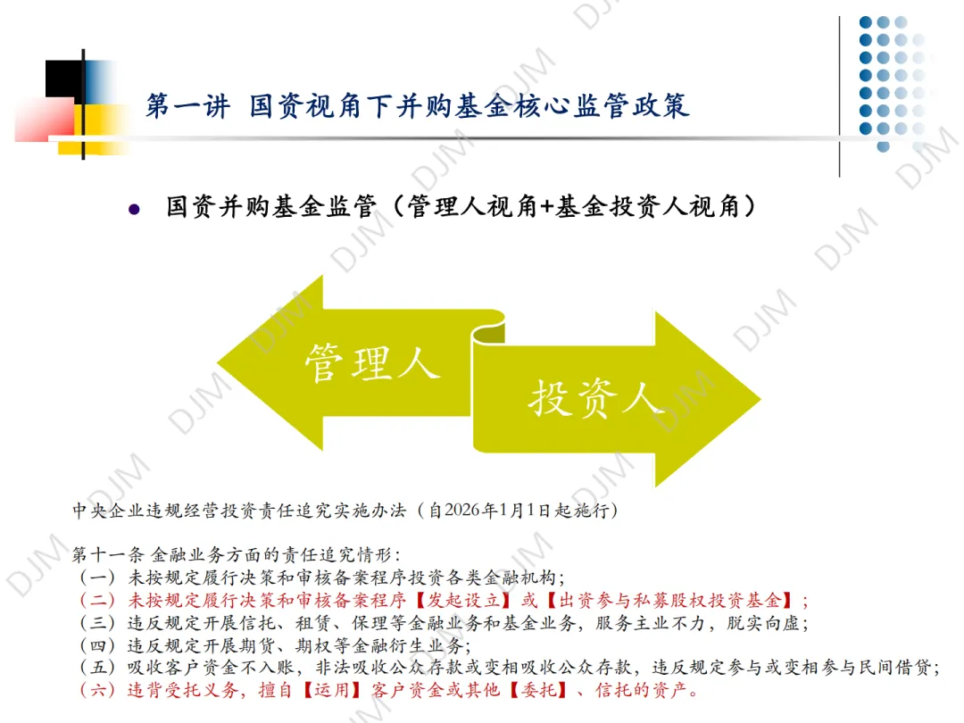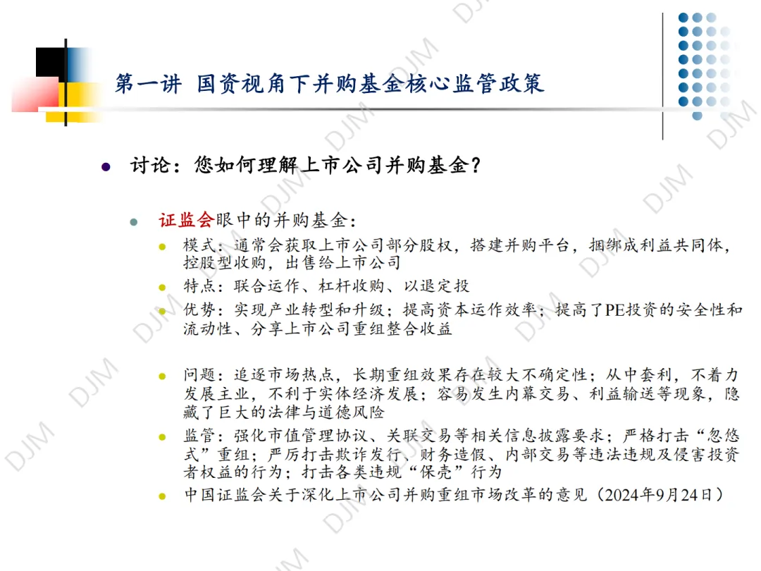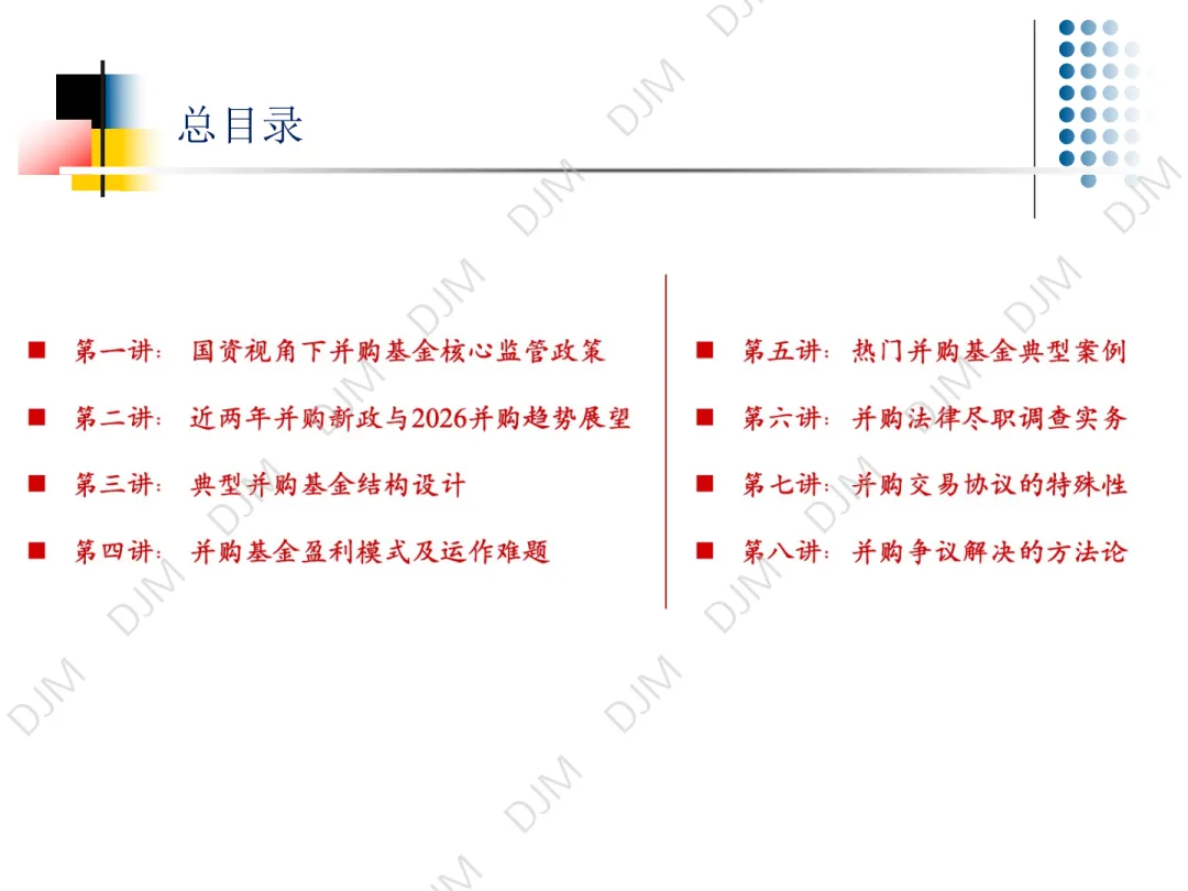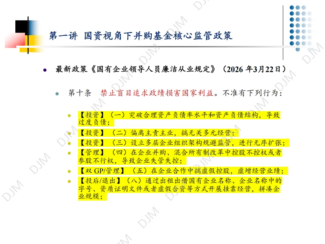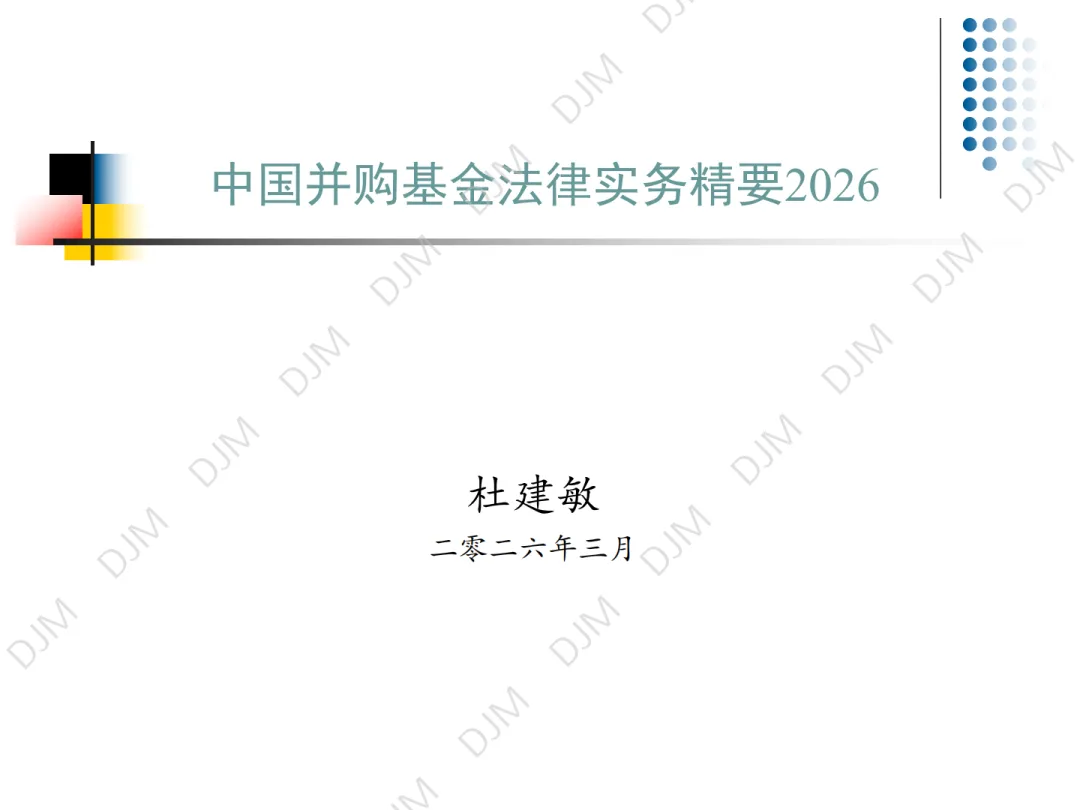2026 年 3 月 24 日,第一讲《国资视角下并购基金核心监管政策》顺利结束。应广大朋友们要求,并经杜建敏律师授权,本号限时转载发布本讲课件(7 天),感谢大家的关注,欢迎预约、参与后续活动。