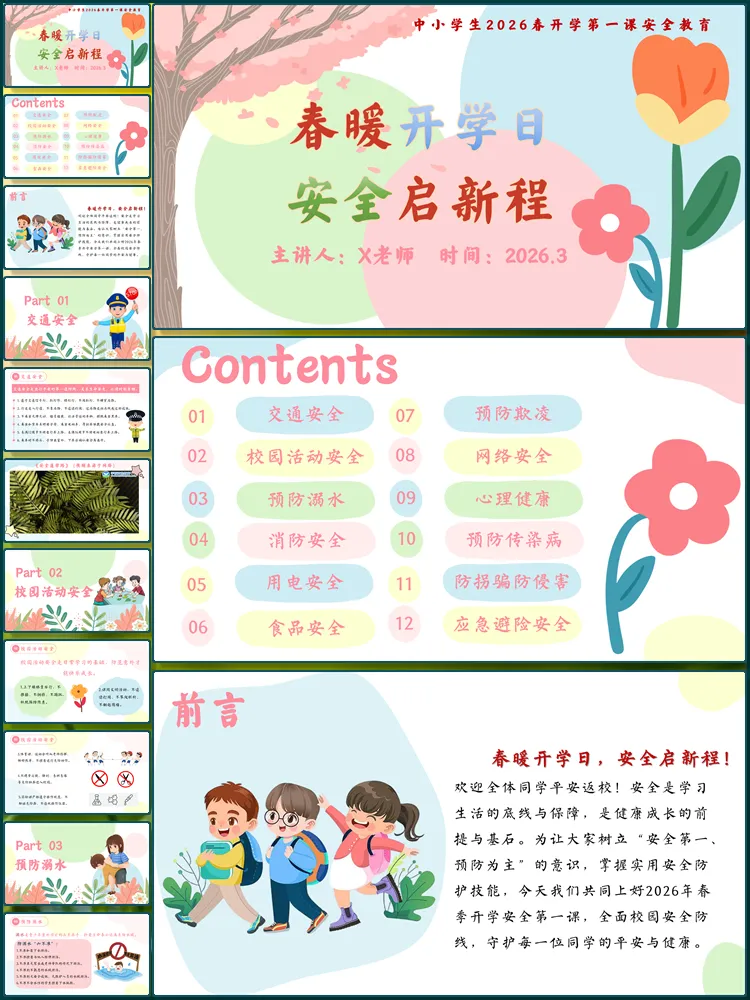 图片展示:【5999】【通用】【春季下】开学安全主题教育班会《春暖开学日,安全启新程》ppt课件+教案+逐字稿(共34张ppt)