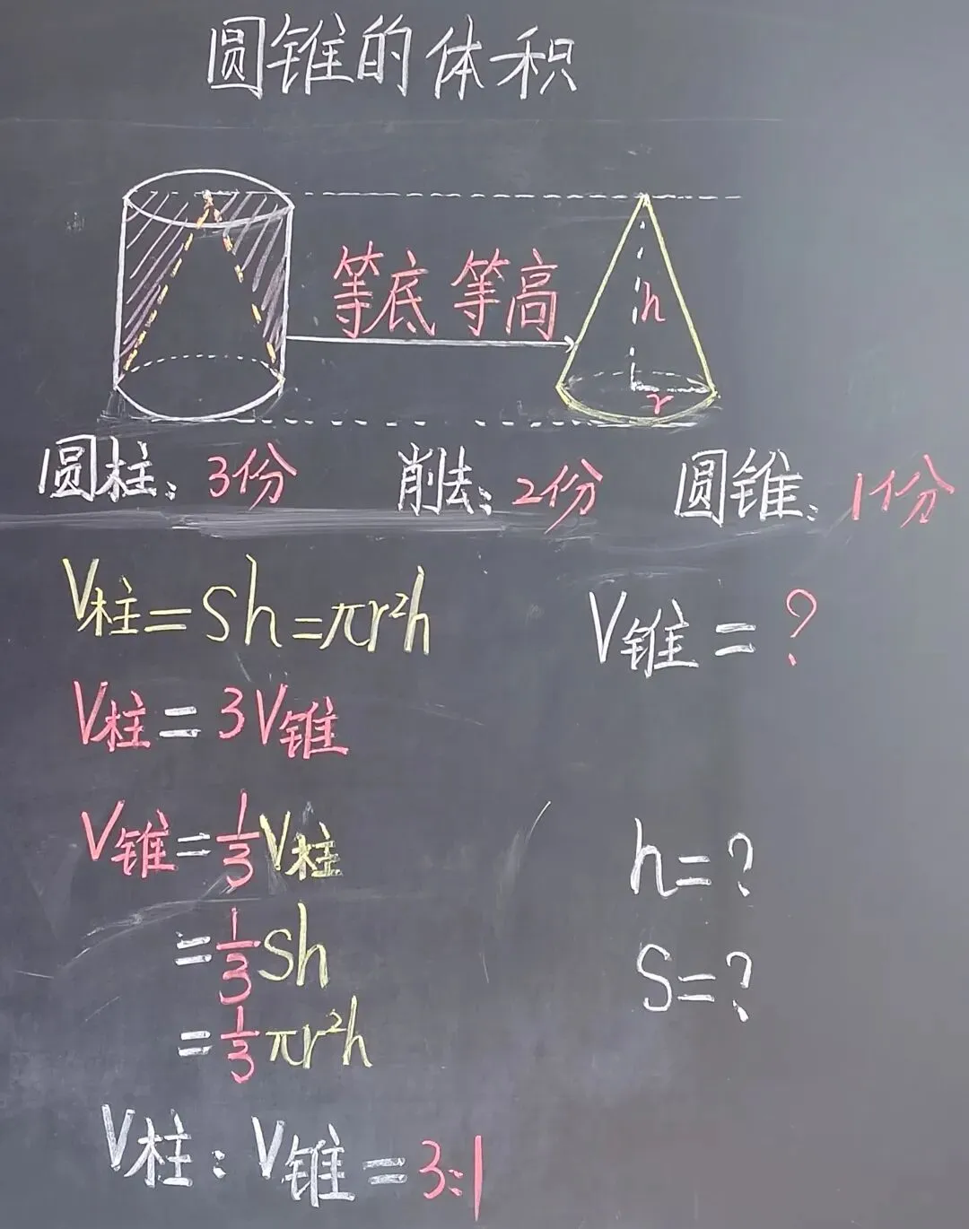 V锥=1/3V柱=1/3Sh=1/3πr²h