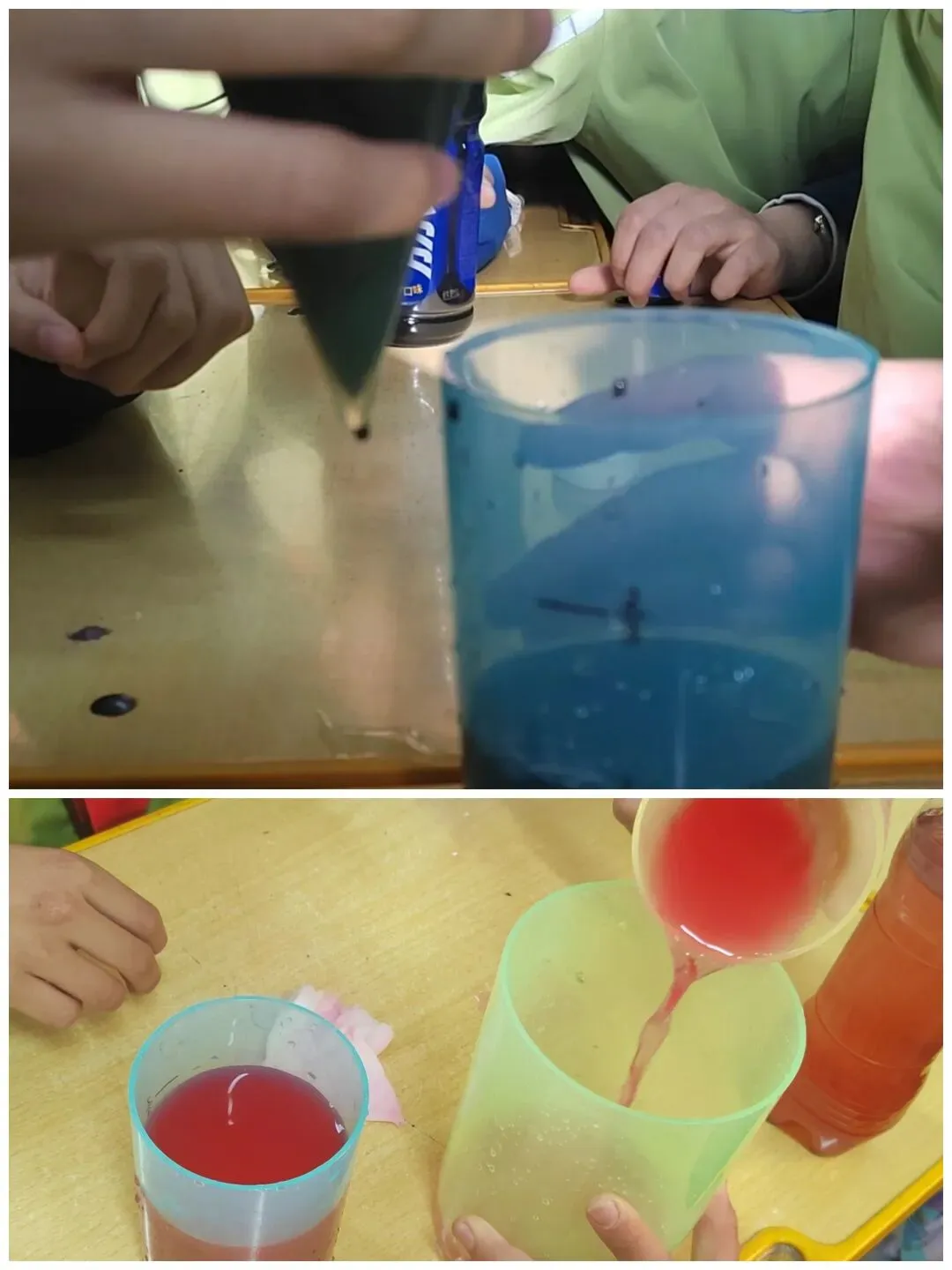 每个小组都领到了等底等高的圆柱和圆锥容器,还有孩子们自己准备的不同颜色的水。