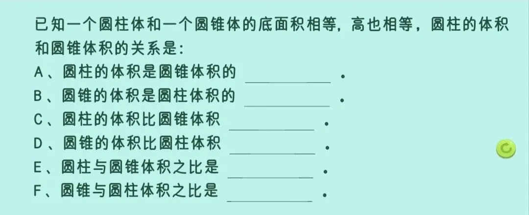不用我多讲,孩子们自己就明白了:“等底等高”是必不可少的前提。只有在这个条件下,圆柱和圆锥的体积才有3倍的关系。以后做题,这个关键点可不能忽略。