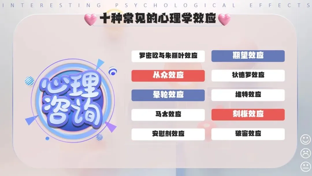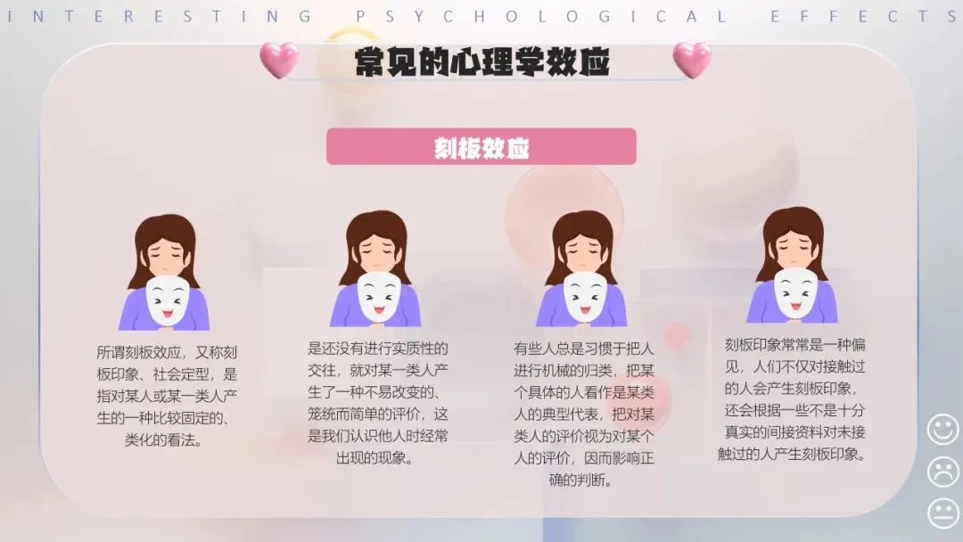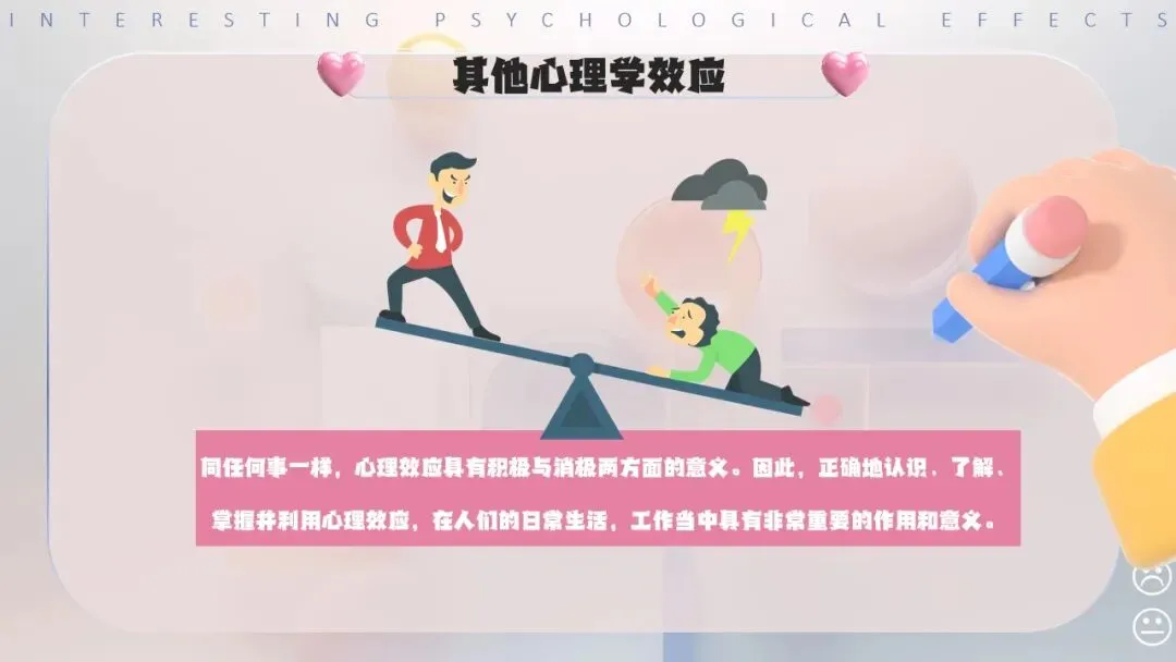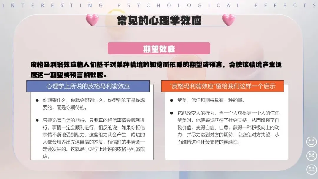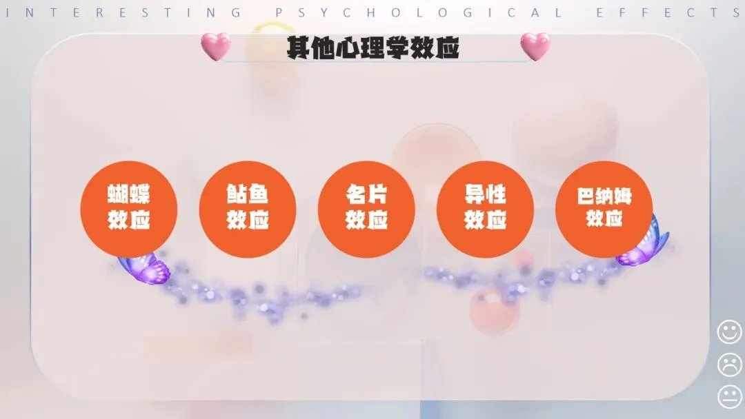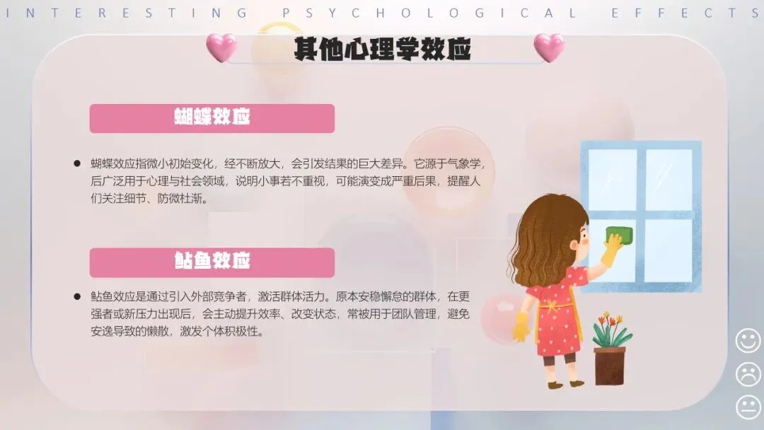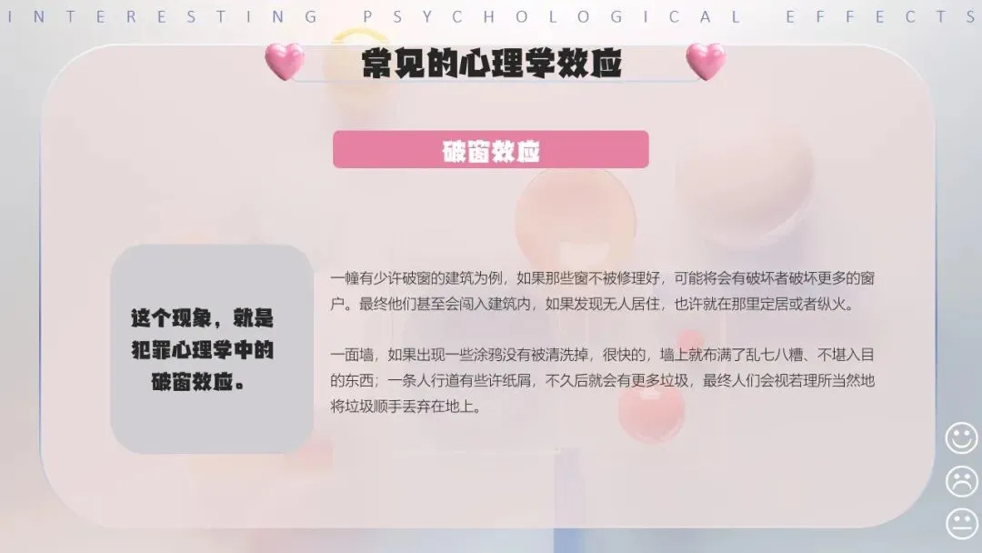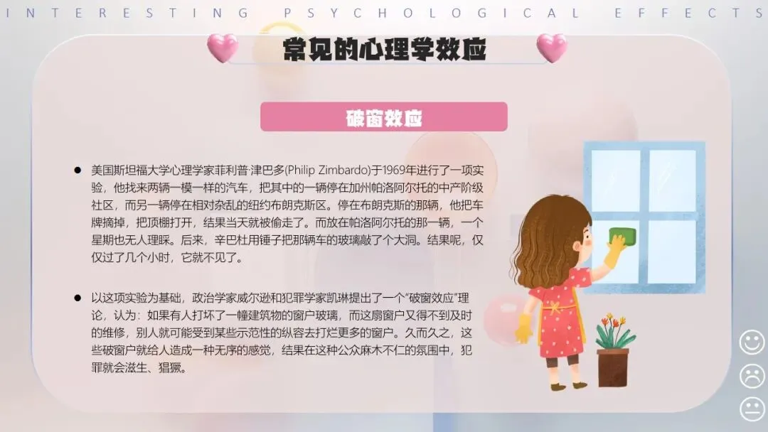 刻板效应克服方法要善于用“眼见之实”去核对“偏听之辞”,有意识地重视和寻求与刻板印象不一致的信息。深入到群体中去,与群体中的成员广泛接触,并重点加强与群体中有典型化、代表性的成员的沟通,不断地检索验证原来刻板印象中与现实相悖的信息,最终克服刻板印象的负面影响而获得准确的认识。10.破窗效应美国斯坦福大学心理学家菲利普·津巴多(Philip Zimbardo)于1969年进行了一项实验,他找来两辆一模一样的汽车,把其中的一辆停在加州帕洛阿尔托的中产阶级社区,而另一辆停在相对杂乱的纽约布朗克斯区。停在布朗克斯的那辆,他把车牌摘掉,把顶棚打开,结果当天就被偷走了。而放在帕洛阿尔托的那一辆,一个星期也无人理睬。后来,辛巴杜用锤子把那辆车的玻璃敲了个大洞。结果呢,仅仅过了几个小时,它就不见了。以这项实验为基础,政治学家威尔逊和犯罪学家凯琳提出了一个“破窗效应”理论,认为:如果有人打坏了一幢建筑物的窗户玻璃,而这扇窗户又得不到及时的维修,别人就可能受到某些示范性的纵容去打烂更多的窗户。久而久之,这些破窗户就给人造成一种无序的感觉,结果在这种公众麻木不仁的氛围中,犯罪就会滋生、猖獗。这个现象,就是犯罪心理学中的破窗效应。三.其他的心理学效应其他心理学效应蝴蝶效应:指微小初始变化,经不断放大,会引发结果的巨大差异。它源于气象学,后广泛用于心理与社会领域,说明小事若不重视,可能演变成严重后果,提醒人们关注细节、防微杜渐。 鲇鱼效应:是通过引入外部竞争者,激活群体活力。原本安稳懈怠的群体,在更强者或新压力出现后,会主动提升效率、改变状态,常被用于团队管理,避免安逸导致的懒散,激发个体积极性。名片效应:是主动亮出与对方相似的观点、态度或经历,快速拉近距离。就像递出一张心理“名片”,让对方产生认同感与亲切感,减少防备心,更易沟通与信任,在社交、说服、职场交流中十分常用。异性效应:指男女共处时,行为更积极、表现更出色。异性在场会让人下意识注重形象、提升效率,竞争与表现欲更强,工作氛围更活跃。合理利用可提升团队氛围,但要把握分寸,保持正常交往。巴纳姆效应:是人们容易把笼统、模糊、普遍的描述,当成精准针对自己的评价。很多星座、性格测试用宽泛话语,让人觉得“很准”,本质是主观验证在起作用。它提醒我们,要理性看待各类测评,不盲目轻信,避免被模糊概括误导。这五种效应从细节影响、群体动力、人际沟通、性别互动和自我认知等角度,揭示了常见心理规律,理解并合理运用,能更好地认识自己、处理人际关系、应对生活与工作中的问题。同任何事一样,心理效应具有积极与消极两方面的意义。因此,正确地认识、了解、掌握并利用心理效应,在人们的日常生活,工作当中具有非常重要的作用和意义。 PPT课件展示------------ END ------------更多精彩课件请点击下面合集《情绪管理PPT资料》喜欢赞赏⬇支持一下