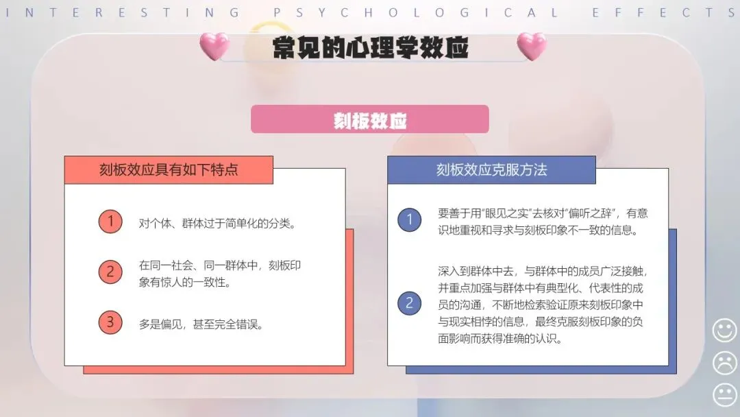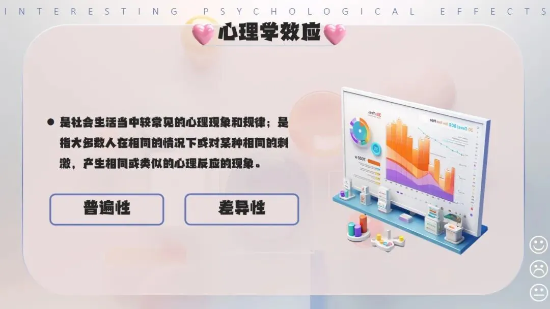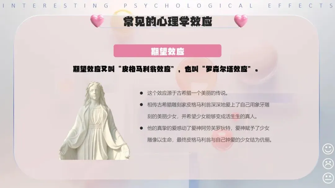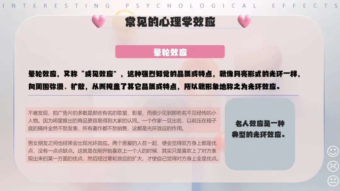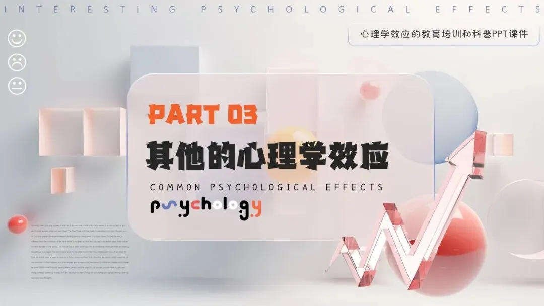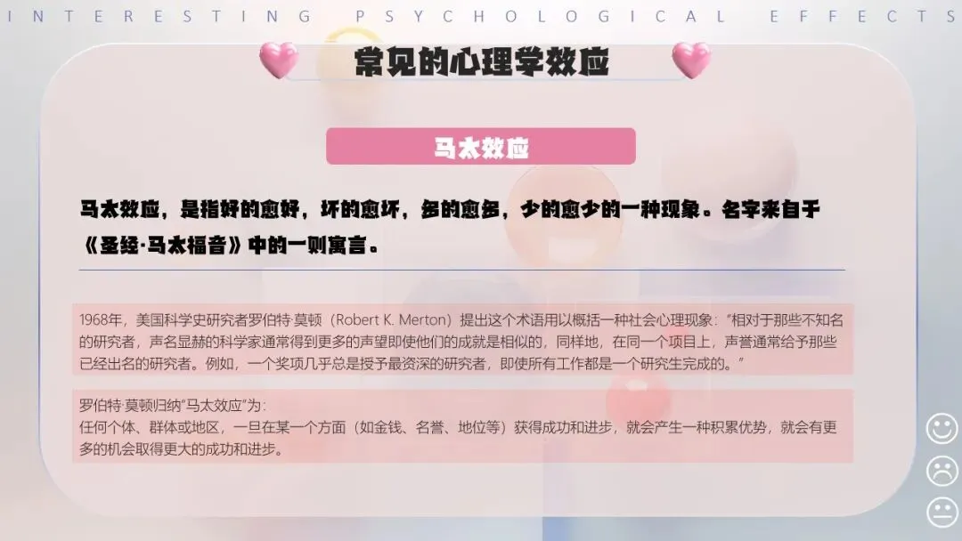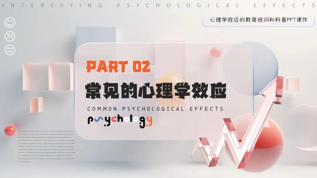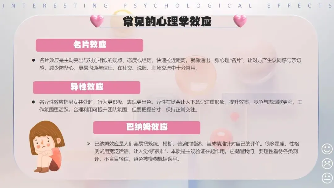 刻板效应克服方法要善于用“眼见之实”去核对“偏听之辞”,有意识地重视和寻求与刻板印象不一致的信息。深入到群体中去,与群体中的成员广泛接触,并重点加强与群体中有典型化、代表性的成员的沟通,不断地检索验证原来刻板印象中与现实相悖的信息,最终克服刻板印象的负面影响而获得准确的认识。10.破窗效应美国斯坦福大学心理学家菲利普·津巴多(Philip Zimbardo)于1969年进行了一项实验,他找来两辆一模一样的汽车,把其中的一辆停在加州帕洛阿尔托的中产阶级社区,而另一辆停在相对杂乱的纽约布朗克斯区。停在布朗克斯的那辆,他把车牌摘掉,把顶棚打开,结果当天就被偷走了。而放在帕洛阿尔托的那一辆,一个星期也无人理睬。后来,辛巴杜用锤子把那辆车的玻璃敲了个大洞。结果呢,仅仅过了几个小时,它就不见了。以这项实验为基础,政治学家威尔逊和犯罪学家凯琳提出了一个“破窗效应”理论,认为:如果有人打坏了一幢建筑物的窗户玻璃,而这扇窗户又得不到及时的维修,别人就可能受到某些示范性的纵容去打烂更多的窗户。久而久之,这些破窗户就给人造成一种无序的感觉,结果在这种公众麻木不仁的氛围中,犯罪就会滋生、猖獗。这个现象,就是犯罪心理学中的破窗效应。三.其他的心理学效应其他心理学效应蝴蝶效应:指微小初始变化,经不断放大,会引发结果的巨大差异。它源于气象学,后广泛用于心理与社会领域,说明小事若不重视,可能演变成严重后果,提醒人们关注细节、防微杜渐。 鲇鱼效应:是通过引入外部竞争者,激活群体活力。原本安稳懈怠的群体,在更强者或新压力出现后,会主动提升效率、改变状态,常被用于团队管理,避免安逸导致的懒散,激发个体积极性。名片效应:是主动亮出与对方相似的观点、态度或经历,快速拉近距离。就像递出一张心理“名片”,让对方产生认同感与亲切感,减少防备心,更易沟通与信任,在社交、说服、职场交流中十分常用。异性效应:指男女共处时,行为更积极、表现更出色。异性在场会让人下意识注重形象、提升效率,竞争与表现欲更强,工作氛围更活跃。合理利用可提升团队氛围,但要把握分寸,保持正常交往。巴纳姆效应:是人们容易把笼统、模糊、普遍的描述,当成精准针对自己的评价。很多星座、性格测试用宽泛话语,让人觉得“很准”,本质是主观验证在起作用。它提醒我们,要理性看待各类测评,不盲目轻信,避免被模糊概括误导。这五种效应从细节影响、群体动力、人际沟通、性别互动和自我认知等角度,揭示了常见心理规律,理解并合理运用,能更好地认识自己、处理人际关系、应对生活与工作中的问题。同任何事一样,心理效应具有积极与消极两方面的意义。因此,正确地认识、了解、掌握并利用心理效应,在人们的日常生活,工作当中具有非常重要的作用和意义。 PPT课件展示------------ END ------------更多精彩课件请点击下面合集《情绪管理PPT资料》喜欢赞赏⬇支持一下