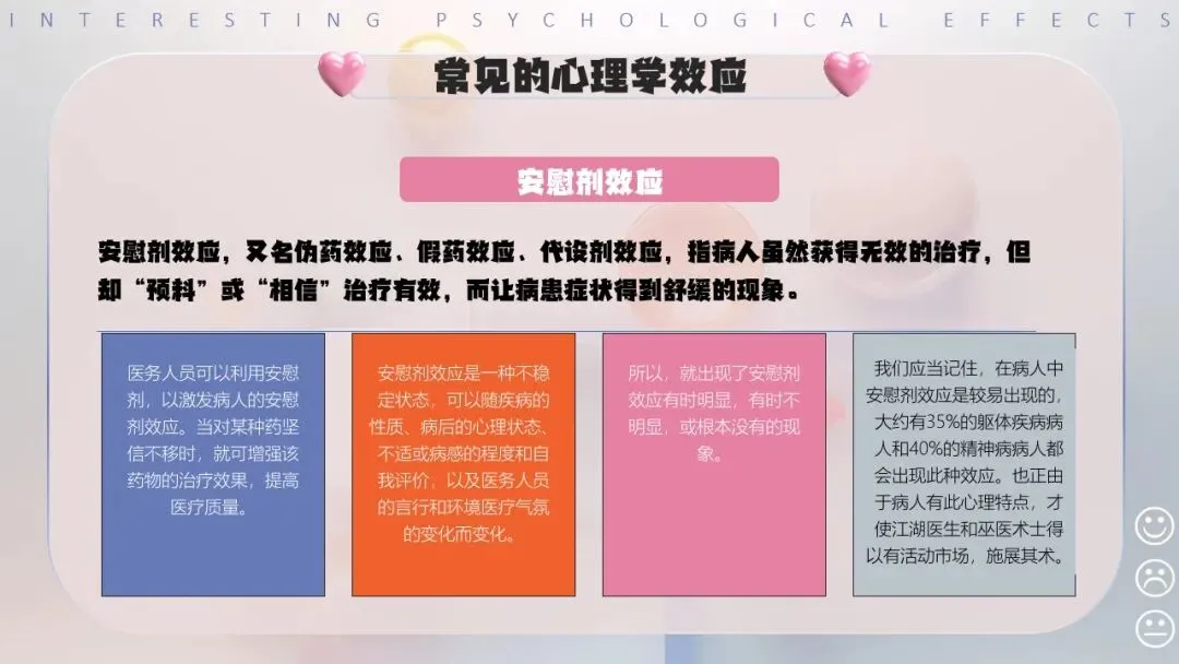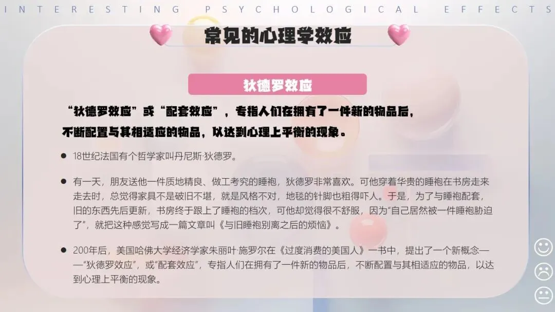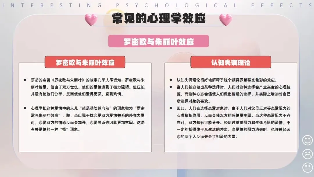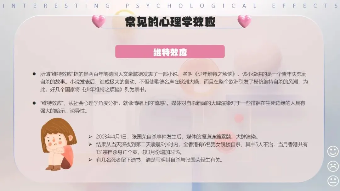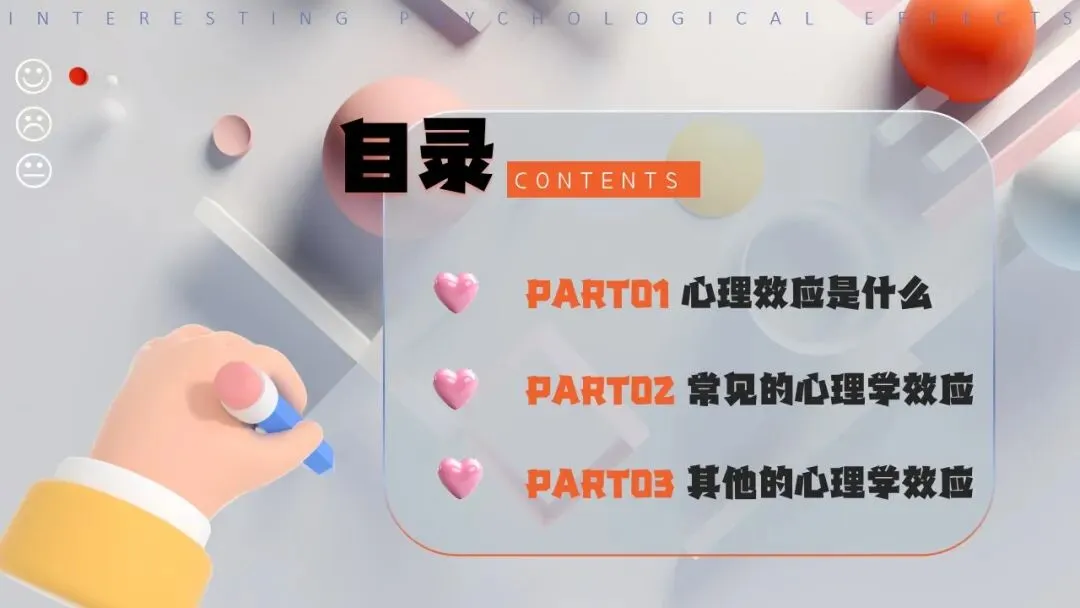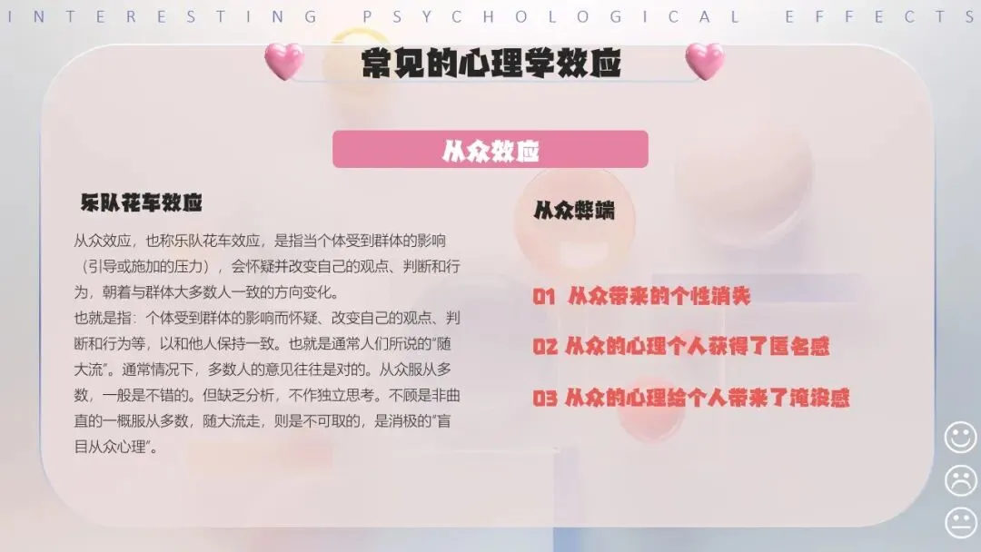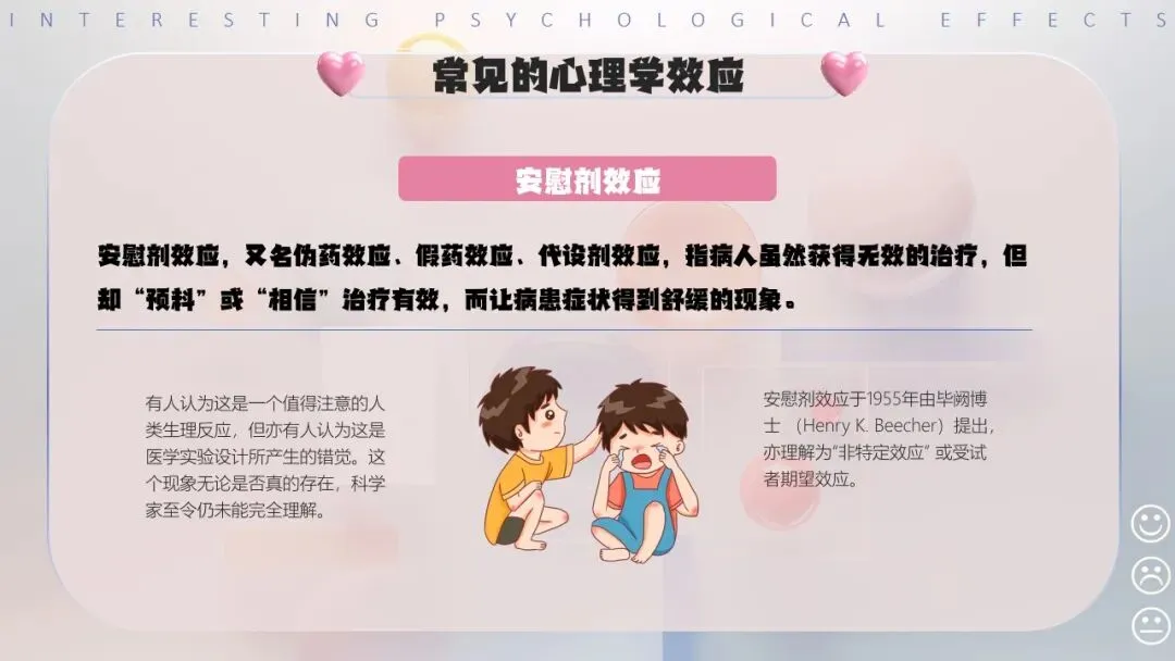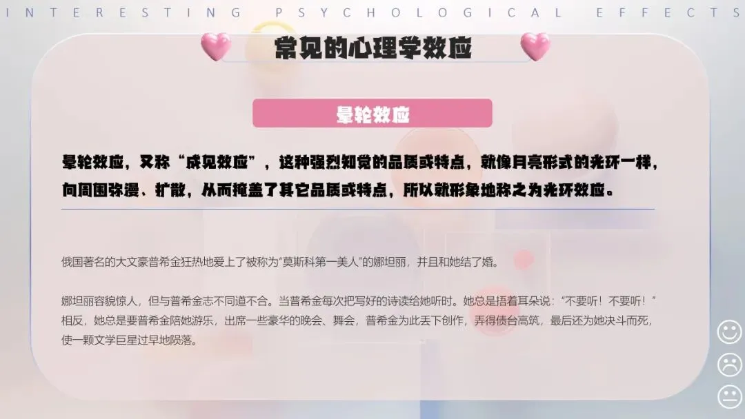 刻板效应克服方法要善于用“眼见之实”去核对“偏听之辞”,有意识地重视和寻求与刻板印象不一致的信息。深入到群体中去,与群体中的成员广泛接触,并重点加强与群体中有典型化、代表性的成员的沟通,不断地检索验证原来刻板印象中与现实相悖的信息,最终克服刻板印象的负面影响而获得准确的认识。10.破窗效应美国斯坦福大学心理学家菲利普·津巴多(Philip Zimbardo)于1969年进行了一项实验,他找来两辆一模一样的汽车,把其中的一辆停在加州帕洛阿尔托的中产阶级社区,而另一辆停在相对杂乱的纽约布朗克斯区。停在布朗克斯的那辆,他把车牌摘掉,把顶棚打开,结果当天就被偷走了。而放在帕洛阿尔托的那一辆,一个星期也无人理睬。后来,辛巴杜用锤子把那辆车的玻璃敲了个大洞。结果呢,仅仅过了几个小时,它就不见了。以这项实验为基础,政治学家威尔逊和犯罪学家凯琳提出了一个“破窗效应”理论,认为:如果有人打坏了一幢建筑物的窗户玻璃,而这扇窗户又得不到及时的维修,别人就可能受到某些示范性的纵容去打烂更多的窗户。久而久之,这些破窗户就给人造成一种无序的感觉,结果在这种公众麻木不仁的氛围中,犯罪就会滋生、猖獗。这个现象,就是犯罪心理学中的破窗效应。三.其他的心理学效应其他心理学效应蝴蝶效应:指微小初始变化,经不断放大,会引发结果的巨大差异。它源于气象学,后广泛用于心理与社会领域,说明小事若不重视,可能演变成严重后果,提醒人们关注细节、防微杜渐。 鲇鱼效应:是通过引入外部竞争者,激活群体活力。原本安稳懈怠的群体,在更强者或新压力出现后,会主动提升效率、改变状态,常被用于团队管理,避免安逸导致的懒散,激发个体积极性。名片效应:是主动亮出与对方相似的观点、态度或经历,快速拉近距离。就像递出一张心理“名片”,让对方产生认同感与亲切感,减少防备心,更易沟通与信任,在社交、说服、职场交流中十分常用。异性效应:指男女共处时,行为更积极、表现更出色。异性在场会让人下意识注重形象、提升效率,竞争与表现欲更强,工作氛围更活跃。合理利用可提升团队氛围,但要把握分寸,保持正常交往。巴纳姆效应:是人们容易把笼统、模糊、普遍的描述,当成精准针对自己的评价。很多星座、性格测试用宽泛话语,让人觉得“很准”,本质是主观验证在起作用。它提醒我们,要理性看待各类测评,不盲目轻信,避免被模糊概括误导。这五种效应从细节影响、群体动力、人际沟通、性别互动和自我认知等角度,揭示了常见心理规律,理解并合理运用,能更好地认识自己、处理人际关系、应对生活与工作中的问题。同任何事一样,心理效应具有积极与消极两方面的意义。因此,正确地认识、了解、掌握并利用心理效应,在人们的日常生活,工作当中具有非常重要的作用和意义。 PPT课件展示------------ END ------------更多精彩课件请点击下面合集《情绪管理PPT资料》喜欢赞赏⬇支持一下