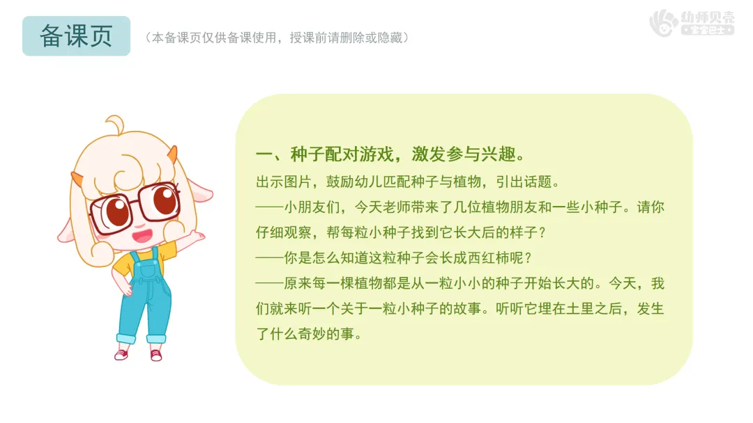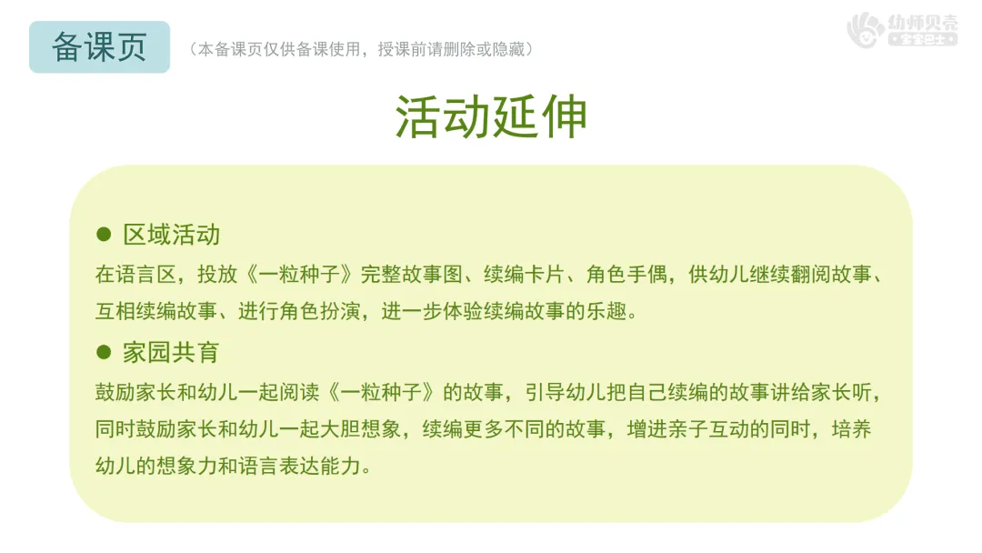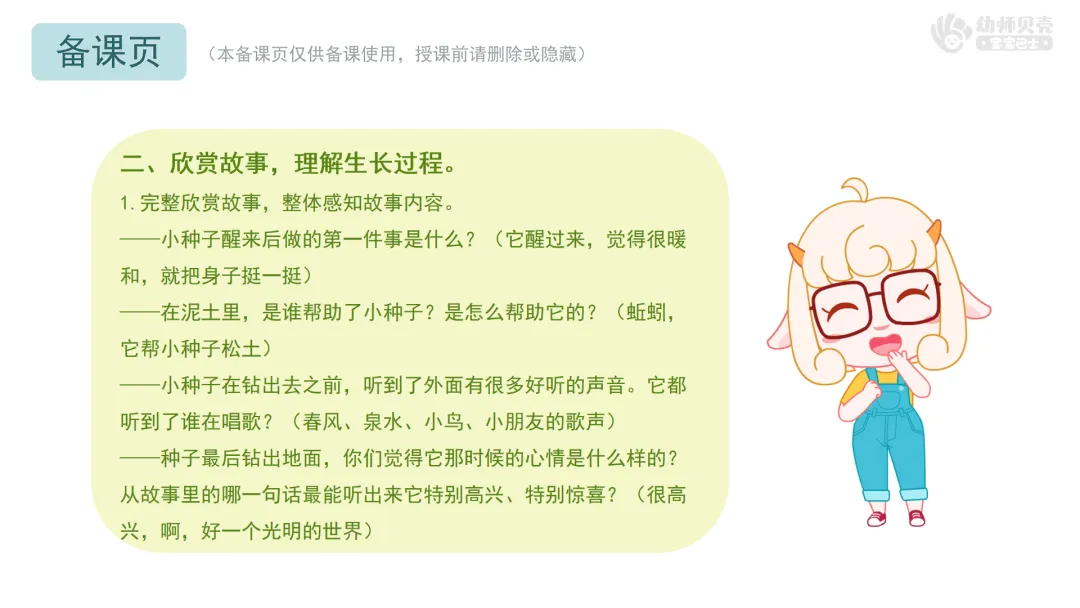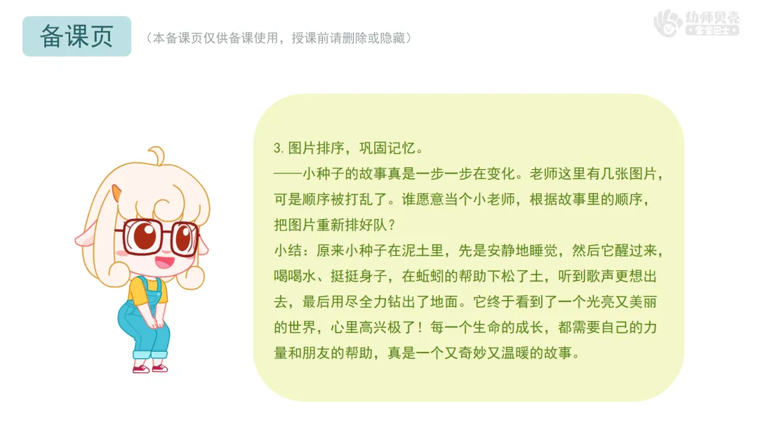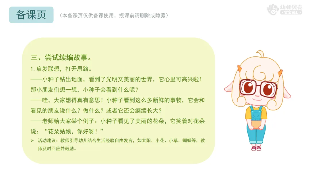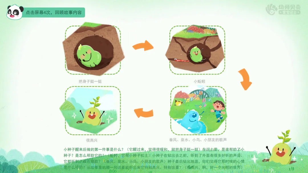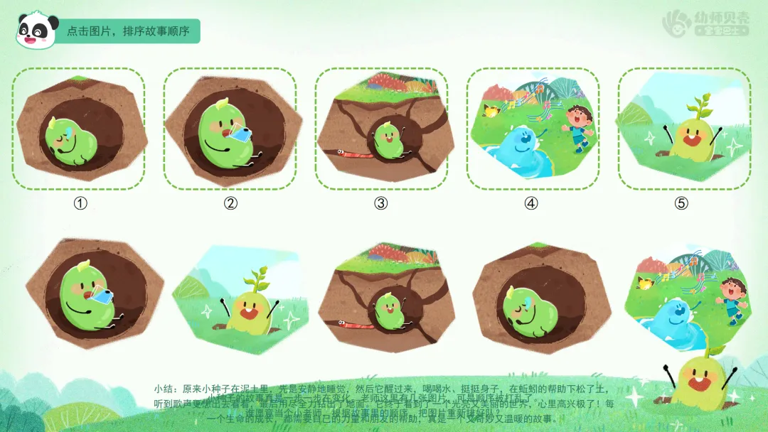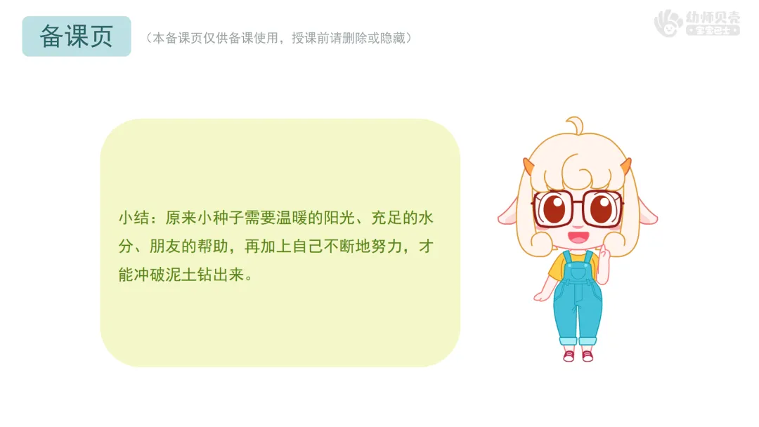 ——今天我们一起听了小种子的成长故事,还当了一回小作家,创造了那么多有趣的后续。原来,只要我们大胆想象、勇敢表达,就能编出属于自己的故事。