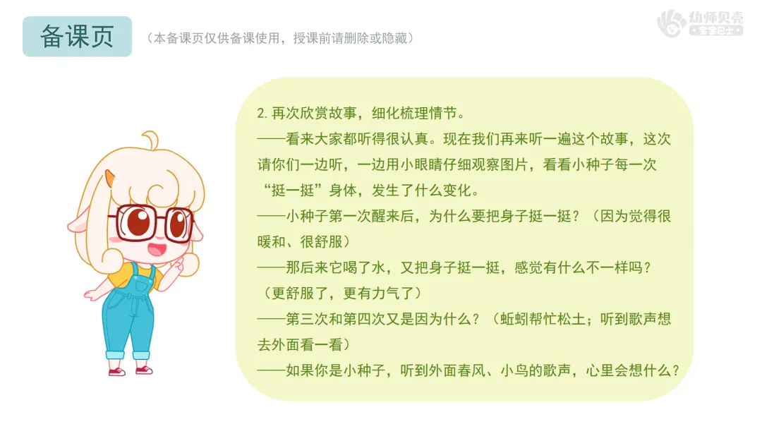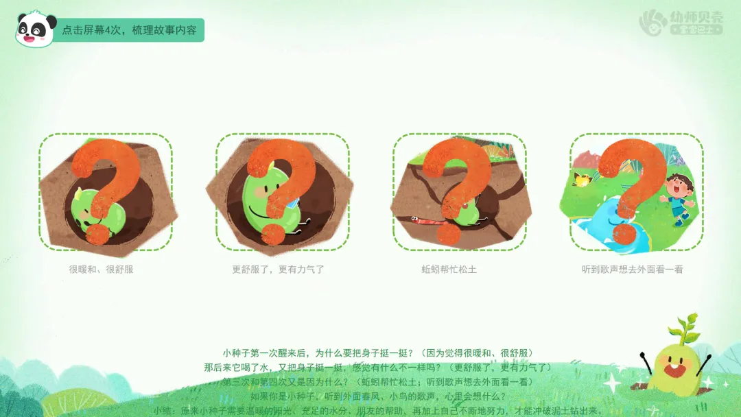 ——看来大家都听得很认真。现在我们再来听一遍这个故事,这次请你们一边听,一边用小眼睛仔细观察图片,看看小种子每一次“挺一挺”身体,发生了什么变化。