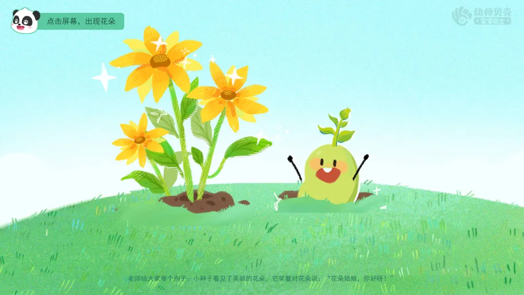 ——老师给大家举个例子:小种子看见了美丽的花朵,它笑着对花朵说:“花朵姑娘,你好呀!”
