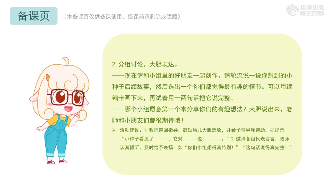 Ø活动建议:1.教师巡回指导,鼓励幼儿大胆想象,并给予引导和帮助,如提示“小种子看见了______,它对______说:______。”2.邀请各组代表发言,教师认真倾听,及时给予表扬,如“你们小组想得真特别!”“这句话说得真完整!”