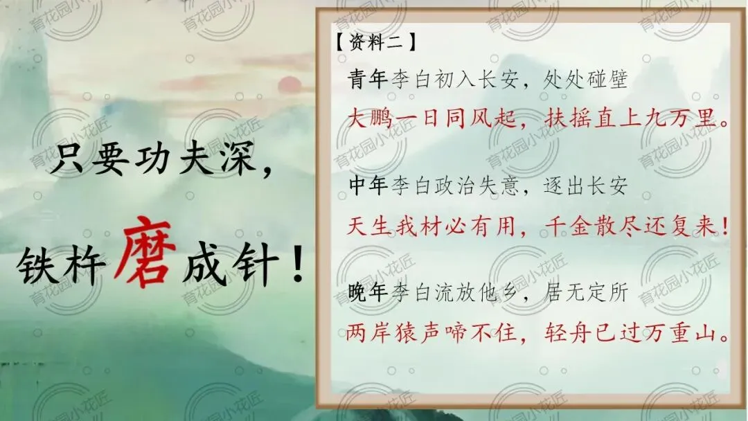 课堂深挖文本文化内涵,以李白“未成弃去” 与 “诗仙” 形象的反差撬动深度思辨,勾连其人生经历与经典诗作,将 “持之以恒” 的成长启示与文化自信培育自然融合,真正实现了文言教学 “言、文、道” 的统一。