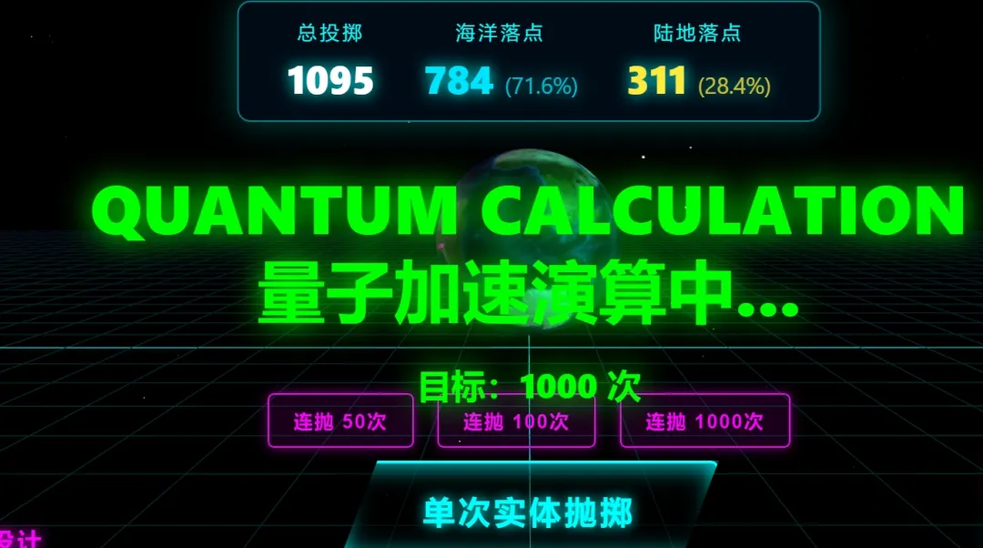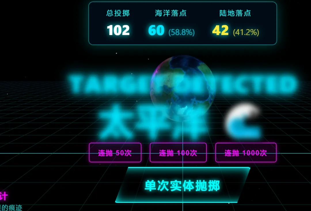 沉浸感:我采用了赛博朋克风的霓虹灯效和科幻音效。当学生点击单次抛掷”时,地球会伴随着推进器的声音腾空而起,随机旋转落地。这种游戏化的体验能瞬间抓住孩子的注意力。