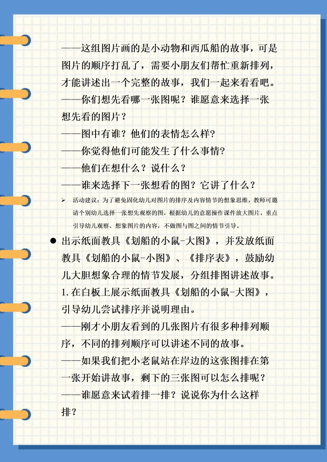 活动目标:大胆想象图片内容,体验排图讲述的乐趣。