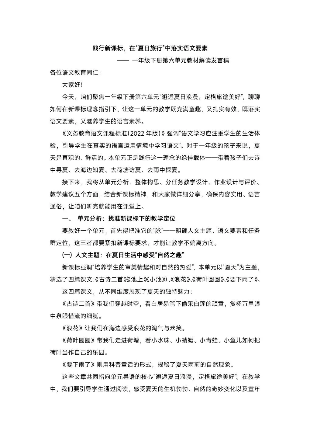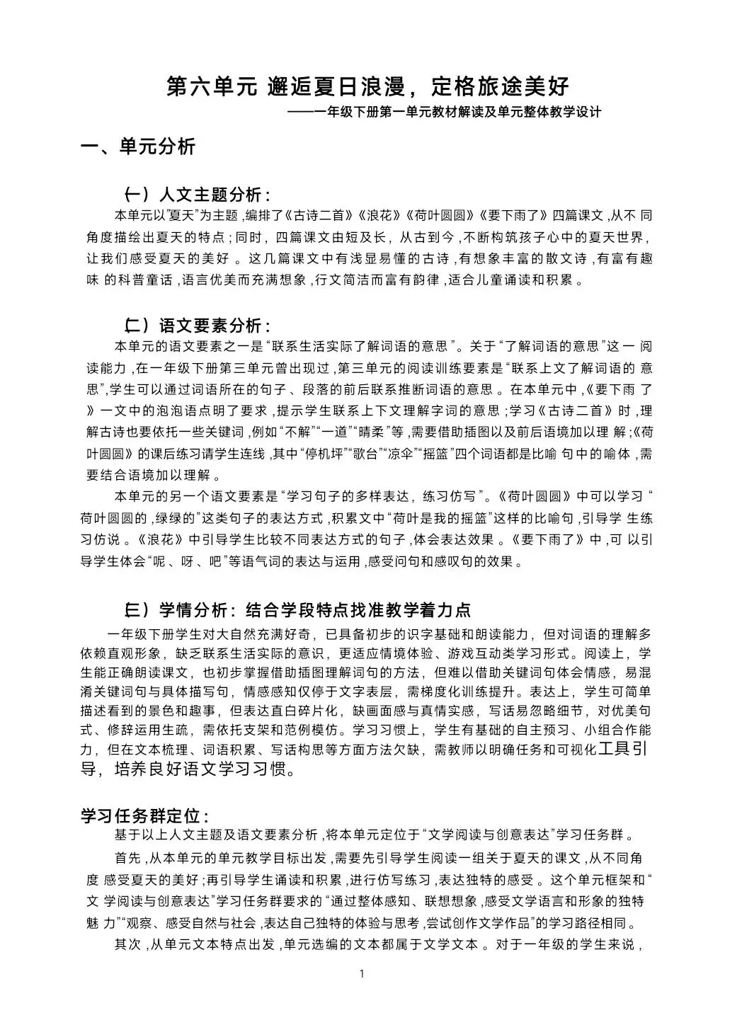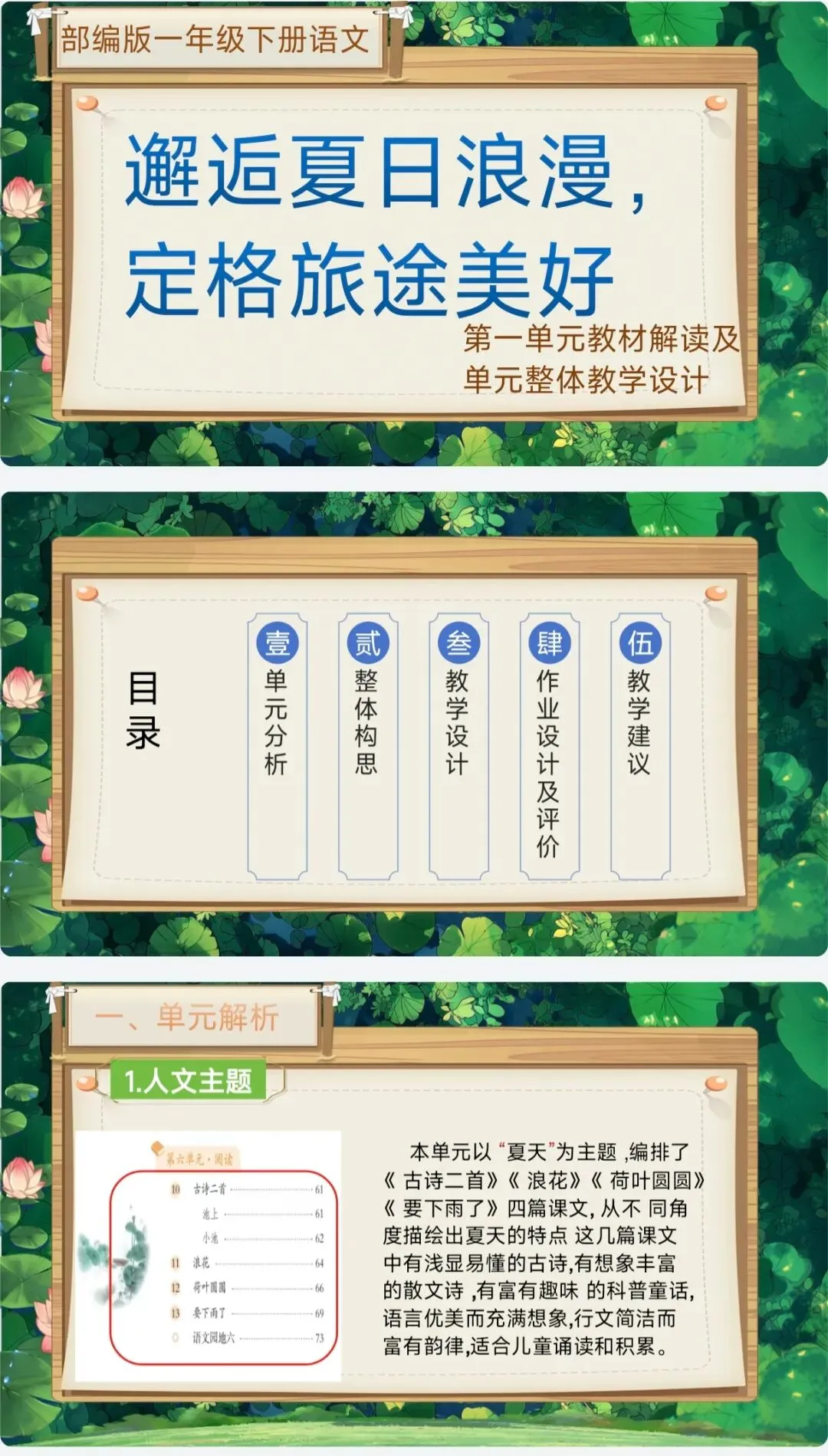 >[单元解读]一年级下册语文第六单元解读课件+单元教学设计+单元说课稿