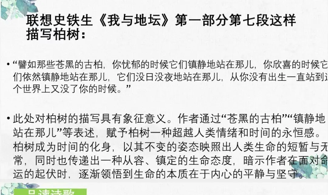 我顺带补了史铁生《我与地坛》中古柏的描写,学生更有画面感。