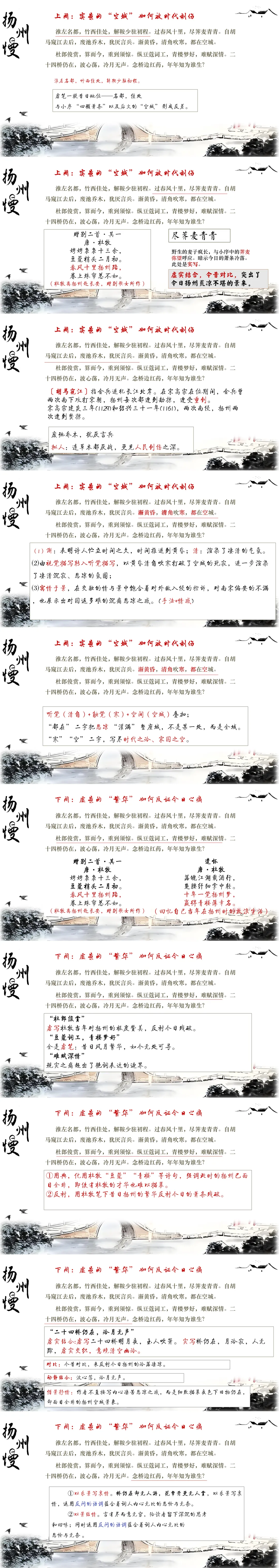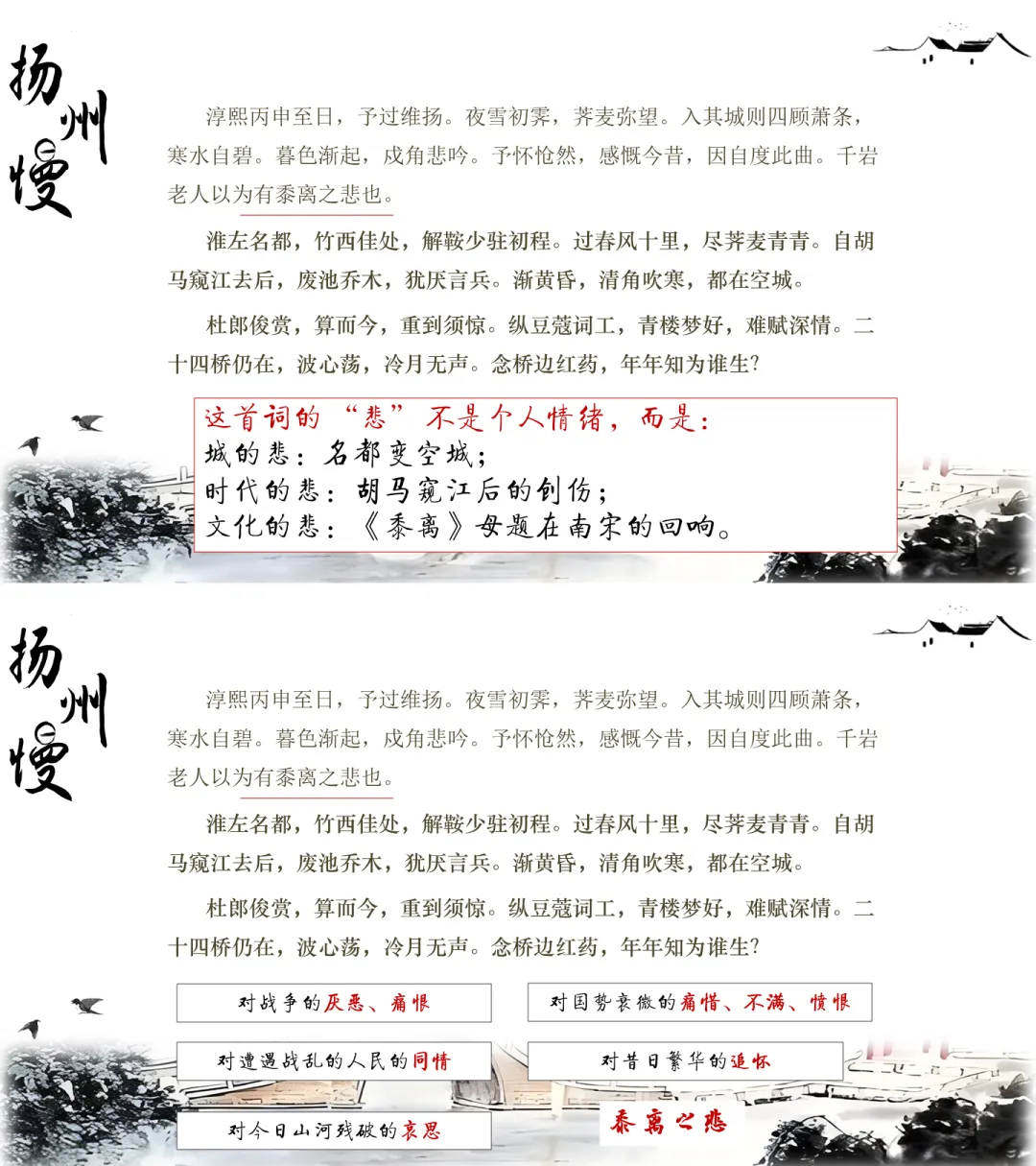 整首词就是这样,虚的是曾经的繁华、诗词里的扬州,实的是战后的残破、眼前的荒凉。姜夔没有大声哭,也没有直接骂,就这么一虚一实写下来,把一座城的兴衰、一个时代的悲伤,全都写透了。