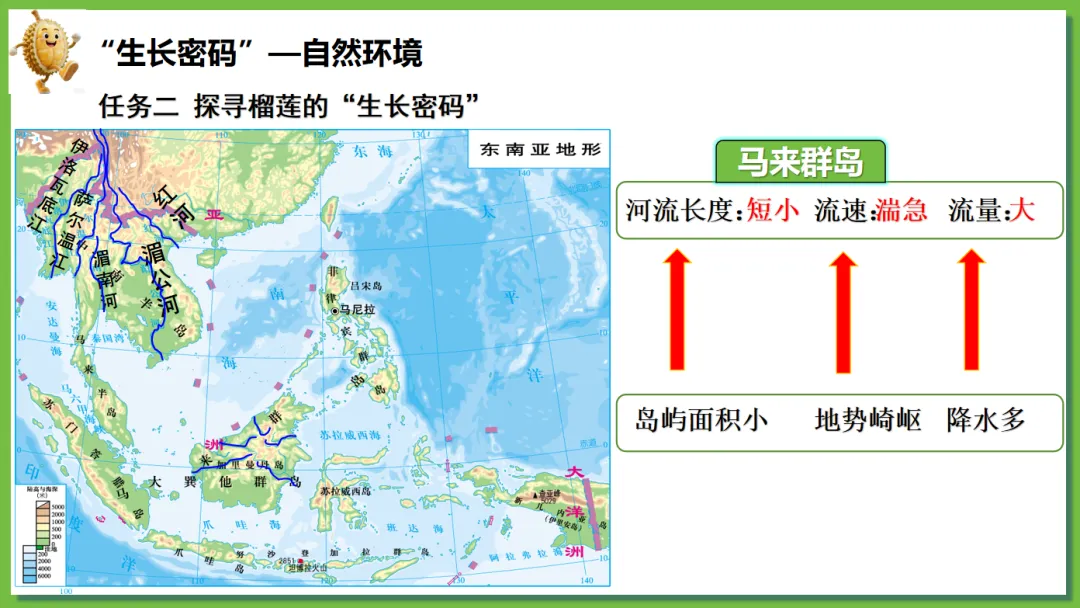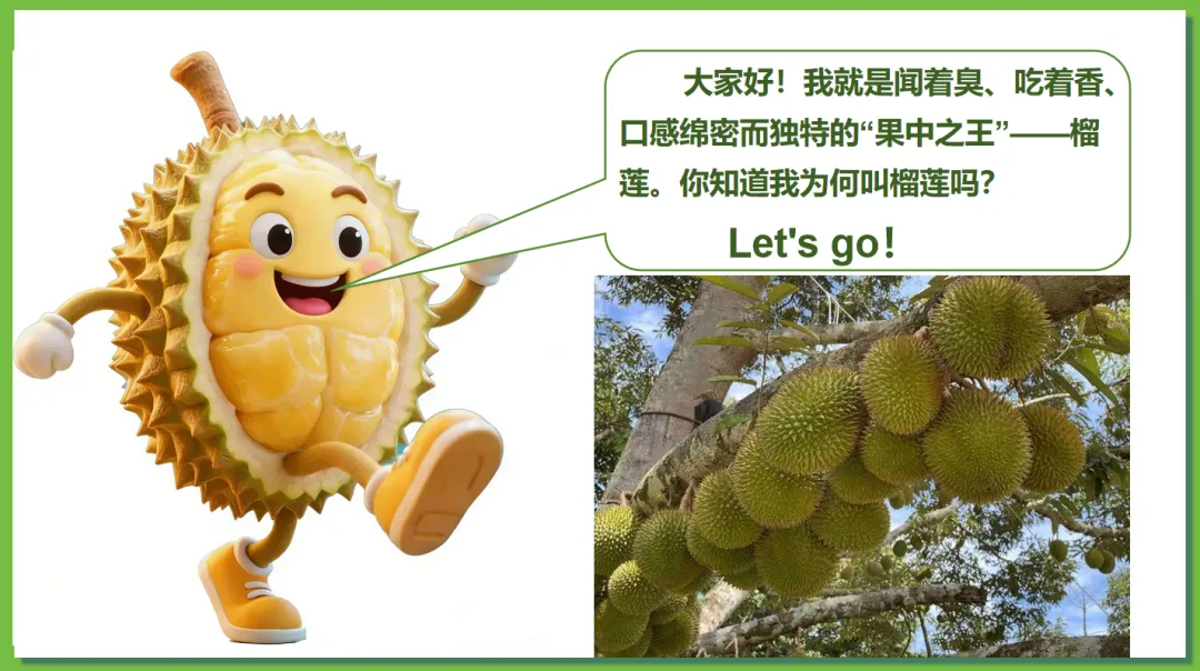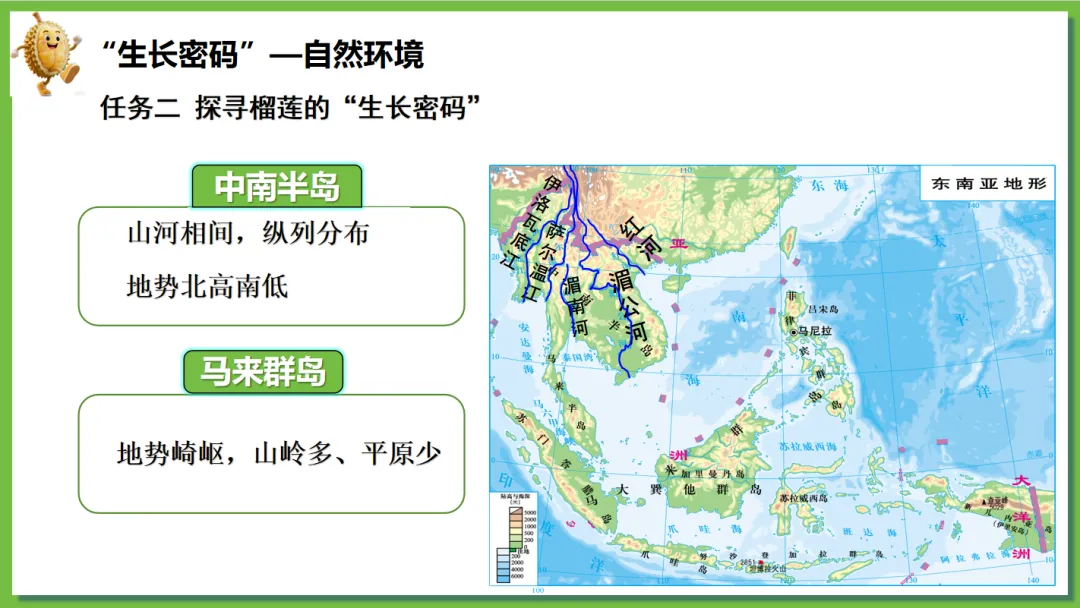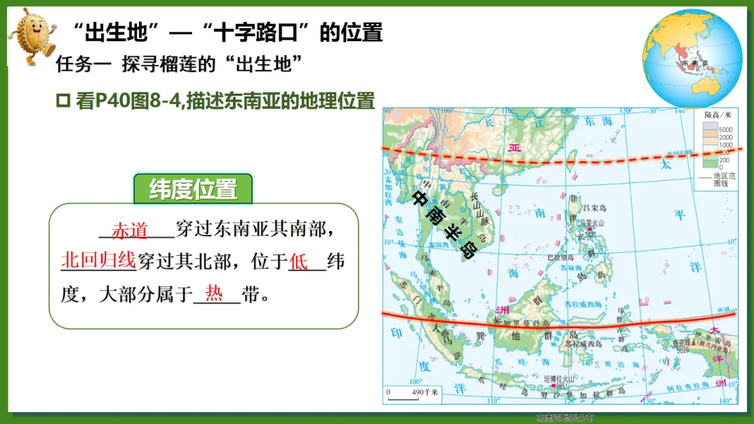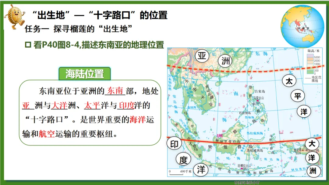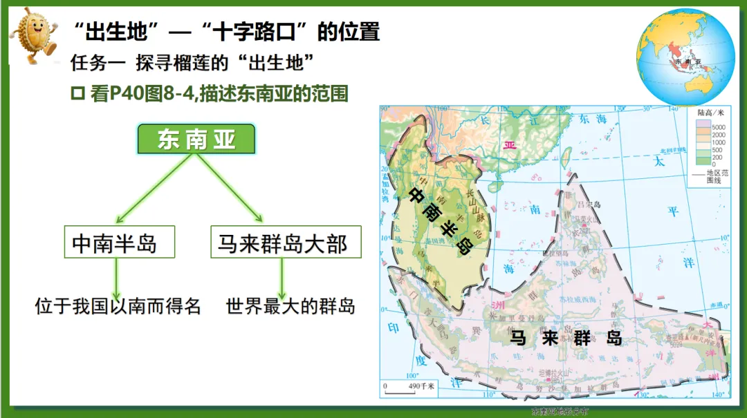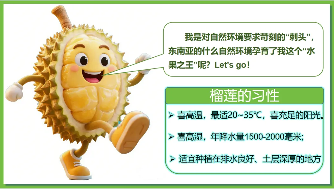 根据学生对“榴莲”这一热门水果兴趣浓厚,创设了“榴莲的跨国之旅”情境线索。榴莲的“出生地”(“十字路口”的位置)→榴莲的“生长密码”(自然环境、人文环境)→榴莲的“跨国之旅”(国家)串联东南亚核心知识点,实现“一物串全域,一境学地理”,激发探究欲望,提高学生核心素养。