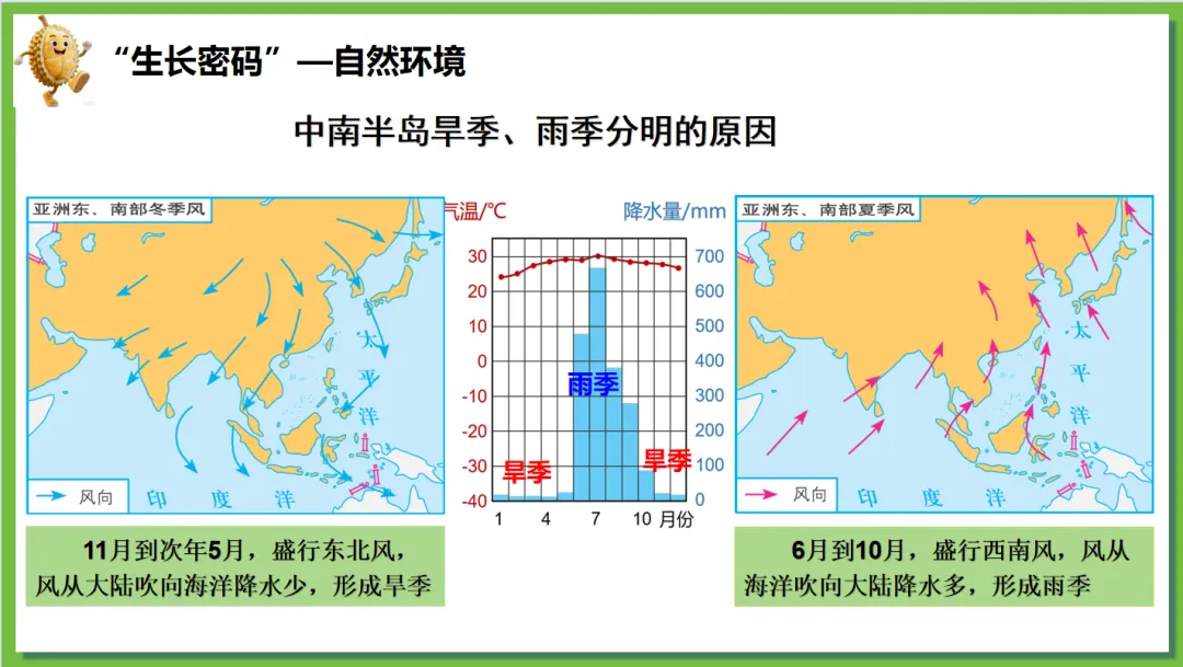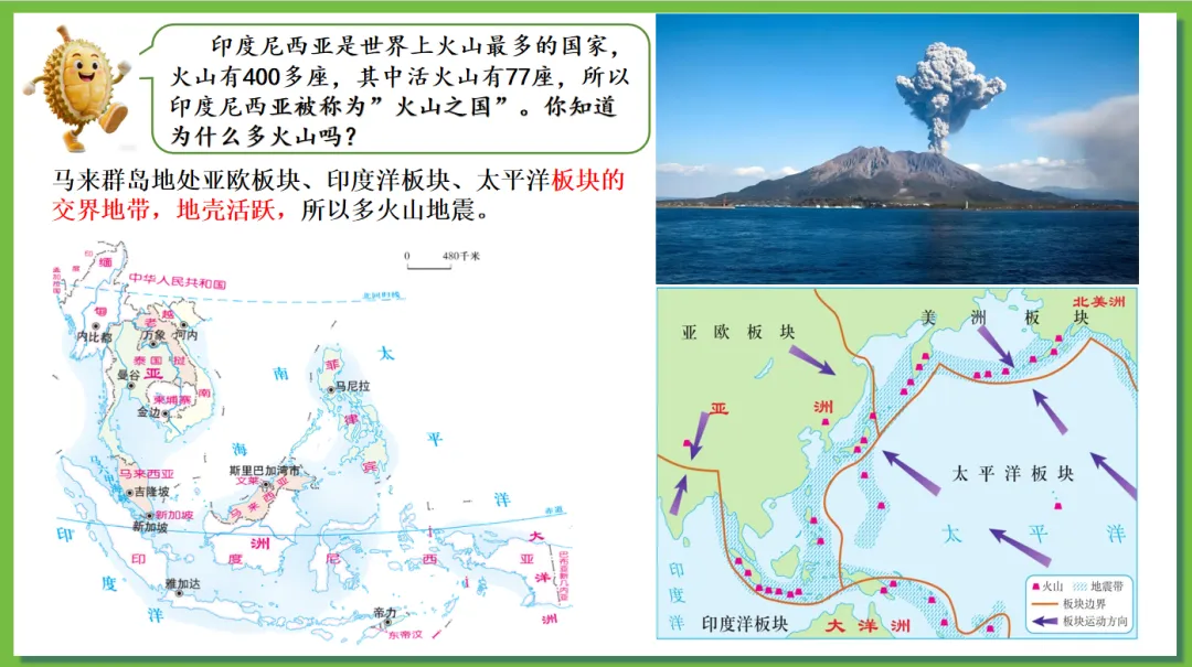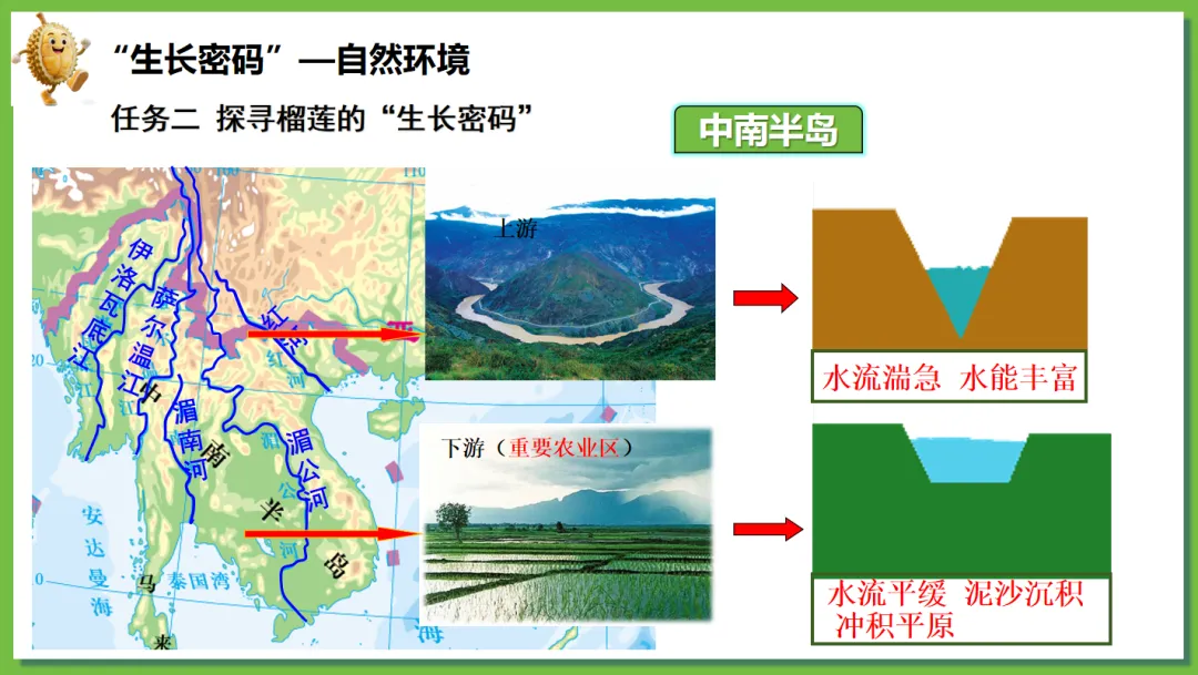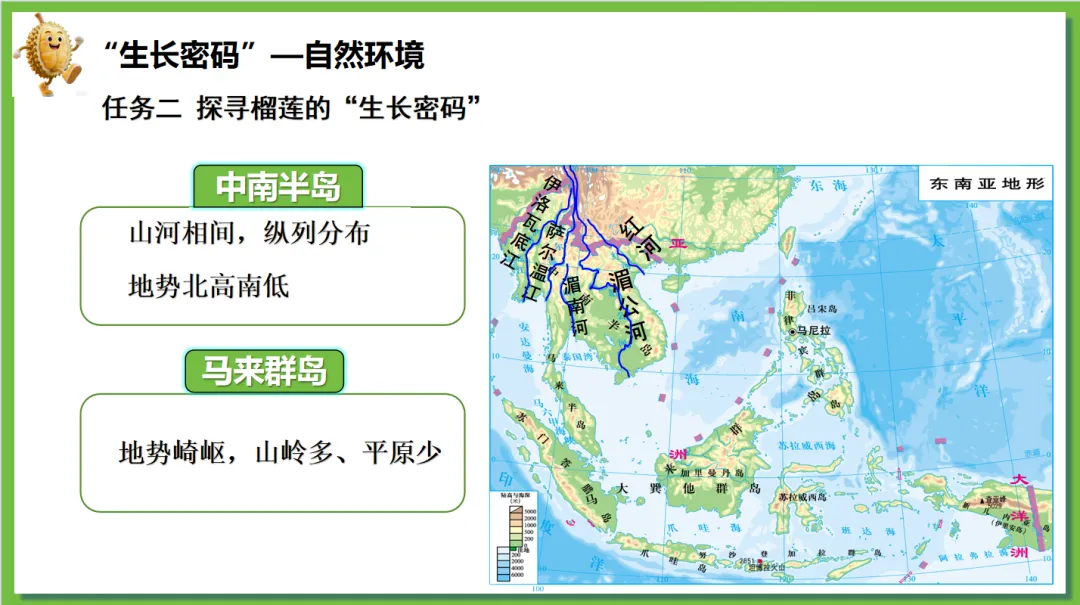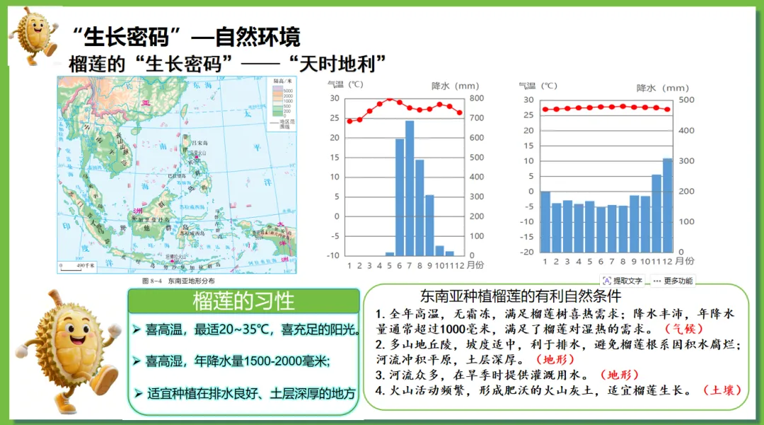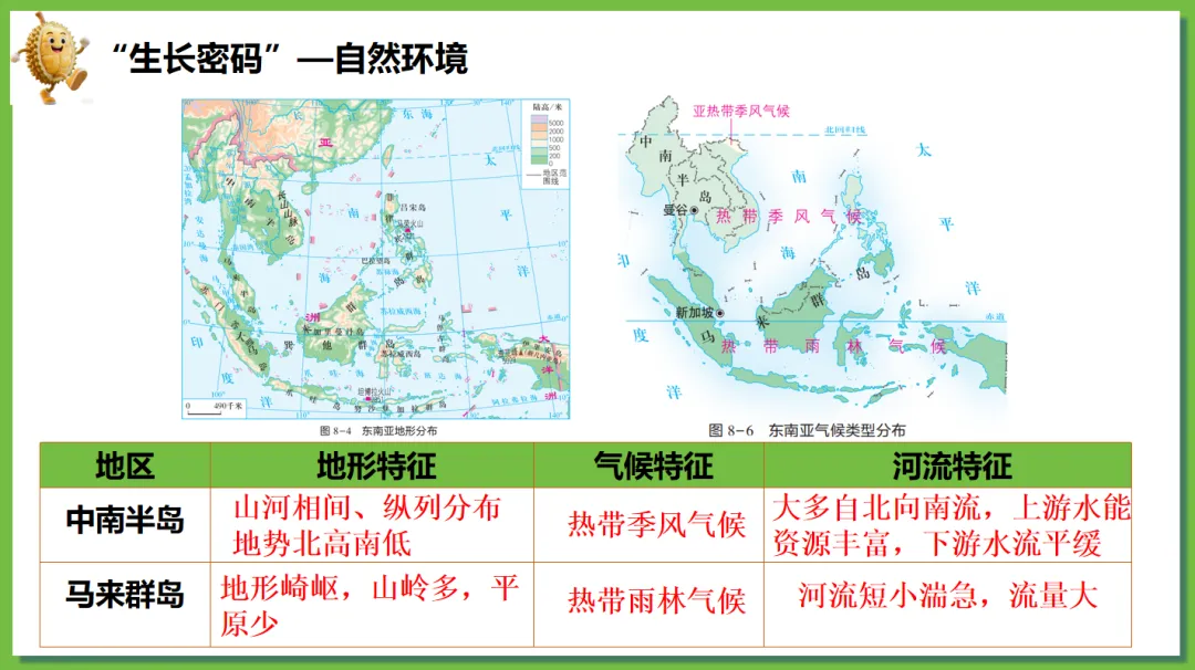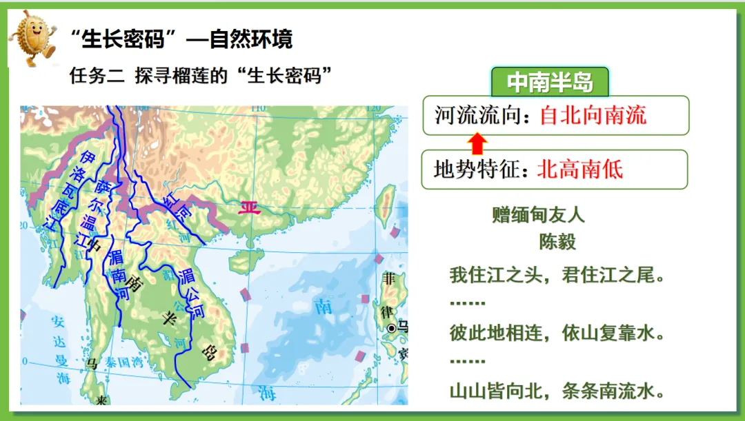 根据学生对“榴莲”这一热门水果兴趣浓厚,创设了“榴莲的跨国之旅”情境线索。榴莲的“出生地”(“十字路口”的位置)→榴莲的“生长密码”(自然环境、人文环境)→榴莲的“跨国之旅”(国家)串联东南亚核心知识点,实现“一物串全域,一境学地理”,激发探究欲望,提高学生核心素养。