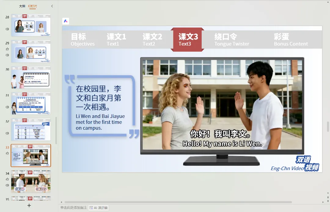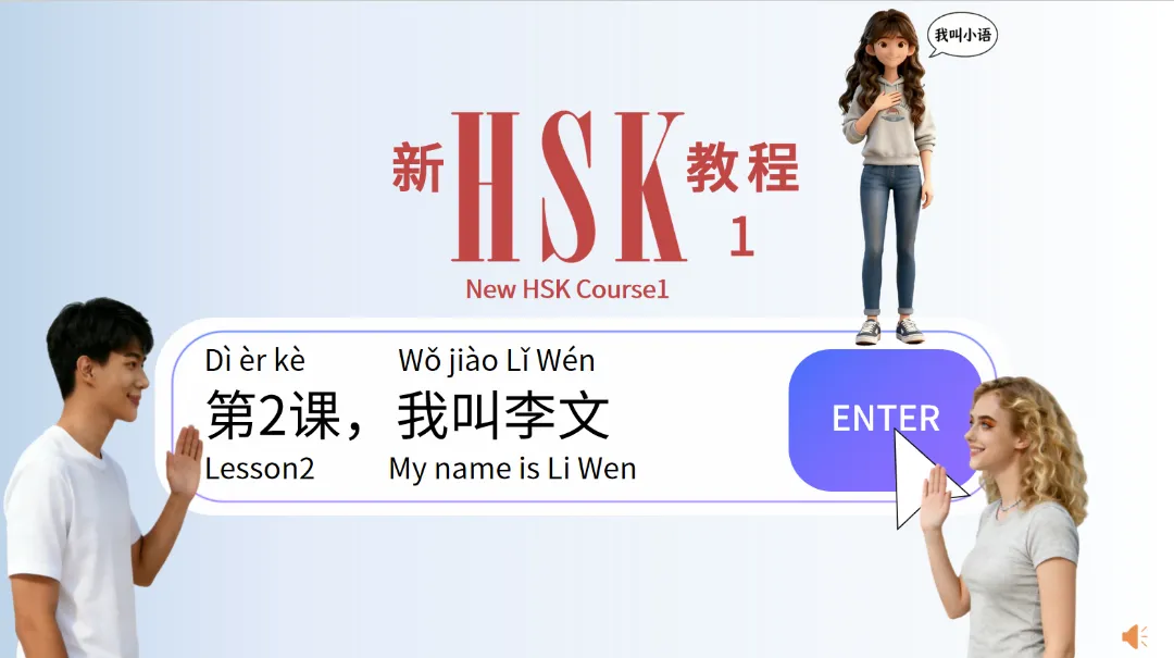 新 HSK 教程第 2 课《我叫李文》课件给出了答案,它以生活化的场景、趣味化的设计,带着零基础学习者轻松解锁中文自我介绍、道歉回应等核心能力,成为对外汉语课堂的优质教学工具。