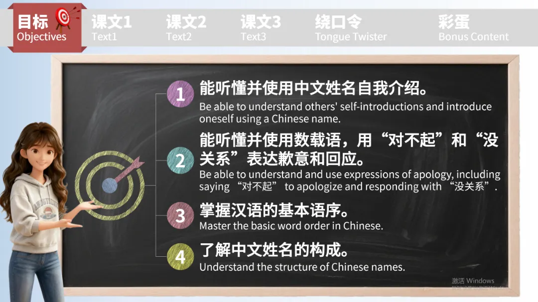 课件开篇就清晰列出四大学习目标,让学习者带着任务学:能听懂并使用中文姓名做自我介绍,会用 “对不起” 和 “没关系” 表达歉意与回应,掌握汉语 “主语 + 谓语 + 宾语” 的基本语序,同时了解中文姓名的构成逻辑。目标清晰易懂,兼顾语言运用与文化认知,帮学习者快速建立学习框架。