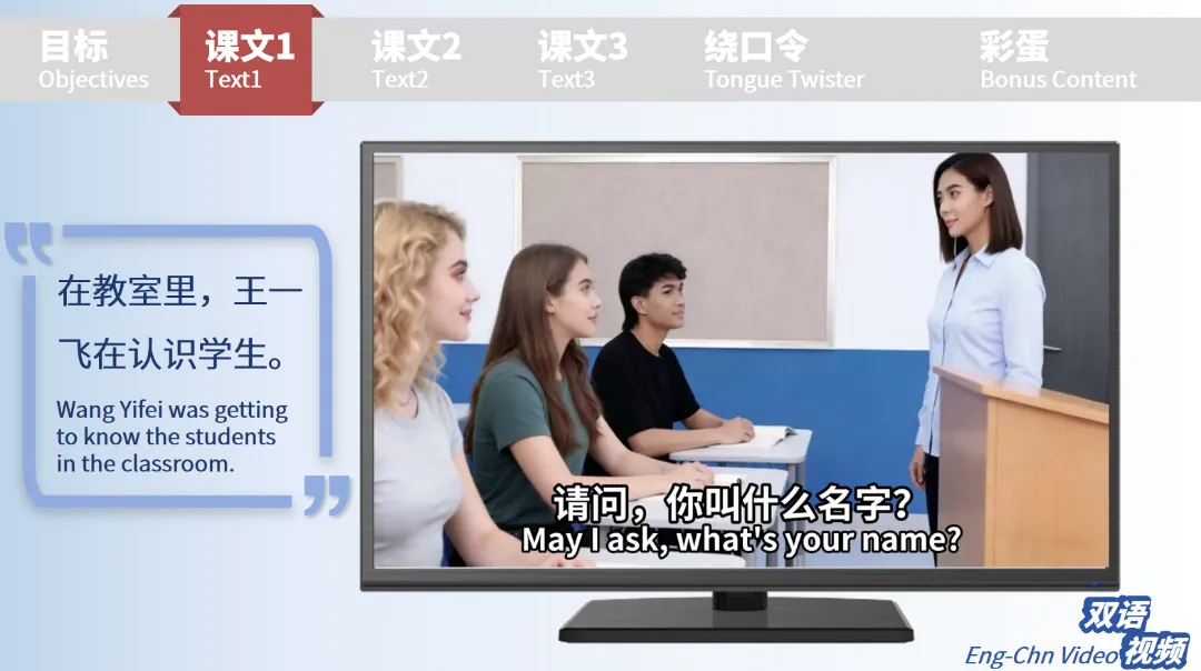 课件设置了三个生活化课文场景,把语言知识融入真实交流中:课文 1 以教室师生相识为背景,通过 “请问,你叫什么名字?” 的经典问句,开启姓名询问的基础表达。