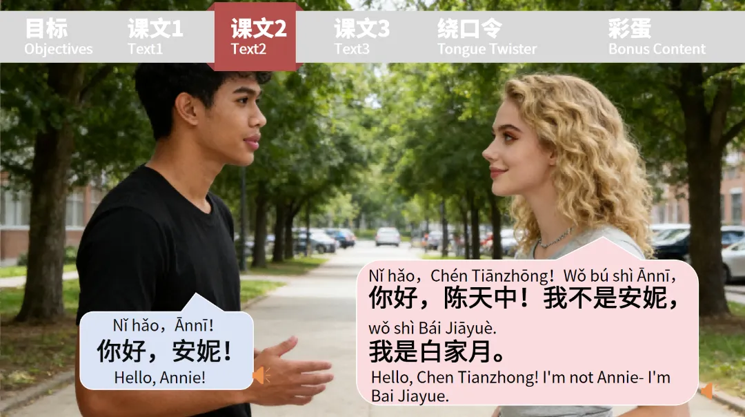 课文 2 围绕校园认错人的情节,引出 “我不是安妮,我是白家月” 的身份澄清句式。