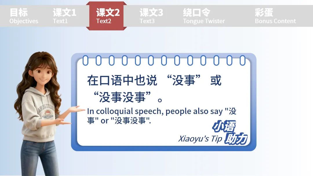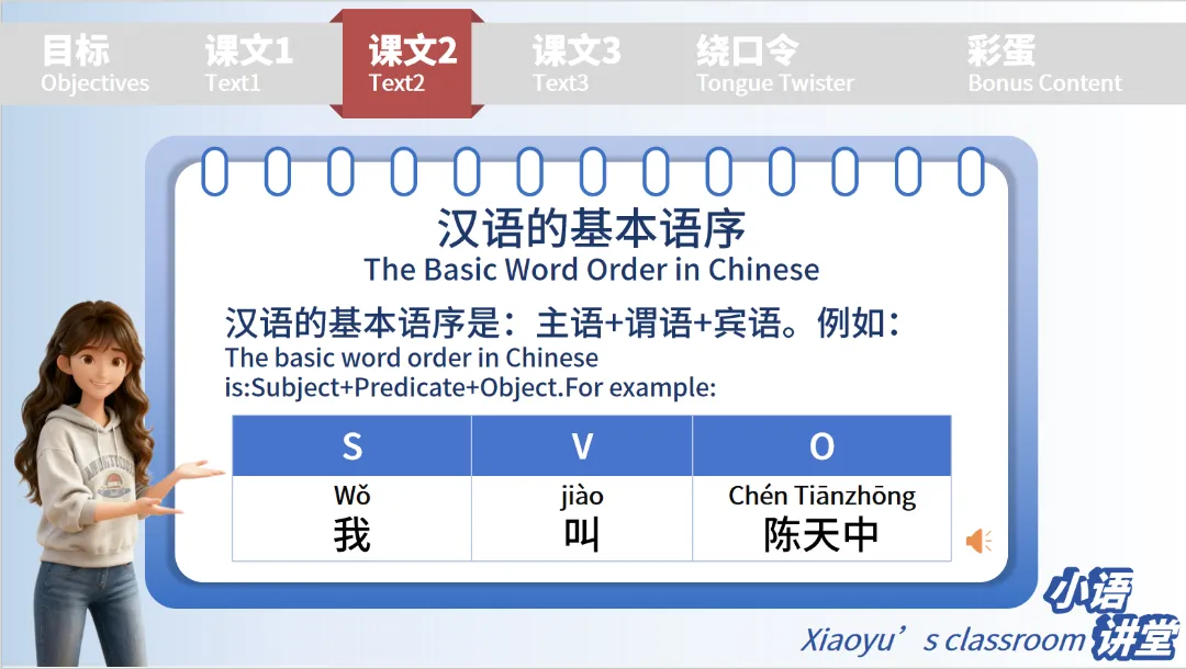 为了让初学者吃透知识点,课件专门设计 “小语助力”“小语讲堂” 板块:不仅补充了 “没事”“没事没事” 等口语化的道歉回应表达,还通过表格拆解汉语基本语序,以 “我叫陈天中” 为例,清晰标注主语(我)、谓语(叫)、宾语(陈天中),把抽象的语法规则变得具象易懂,降低学习难度。