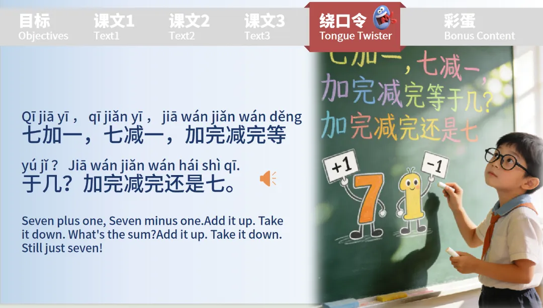 除了核心知识点,课件还加入了绕口令和彩蛋环节增添学习乐趣:绕口令 “七加一,七减一” 结合数字表达,锻炼学习者的中文发音。
