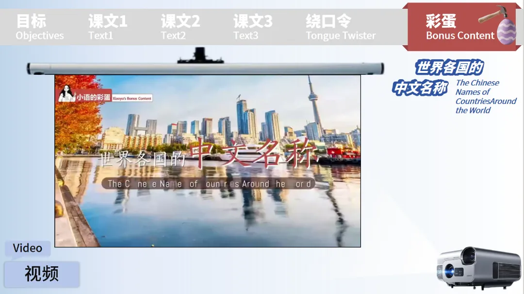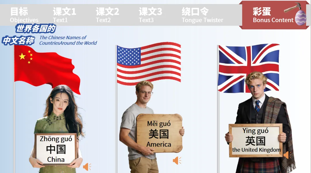 彩蛋部分则以 “世界各国的中文名称” 为主题,搭配国旗和视频素材,在拓展词汇的同时融入跨文化知识,让对外汉语学习不再局限于课本,变得更丰富多元。